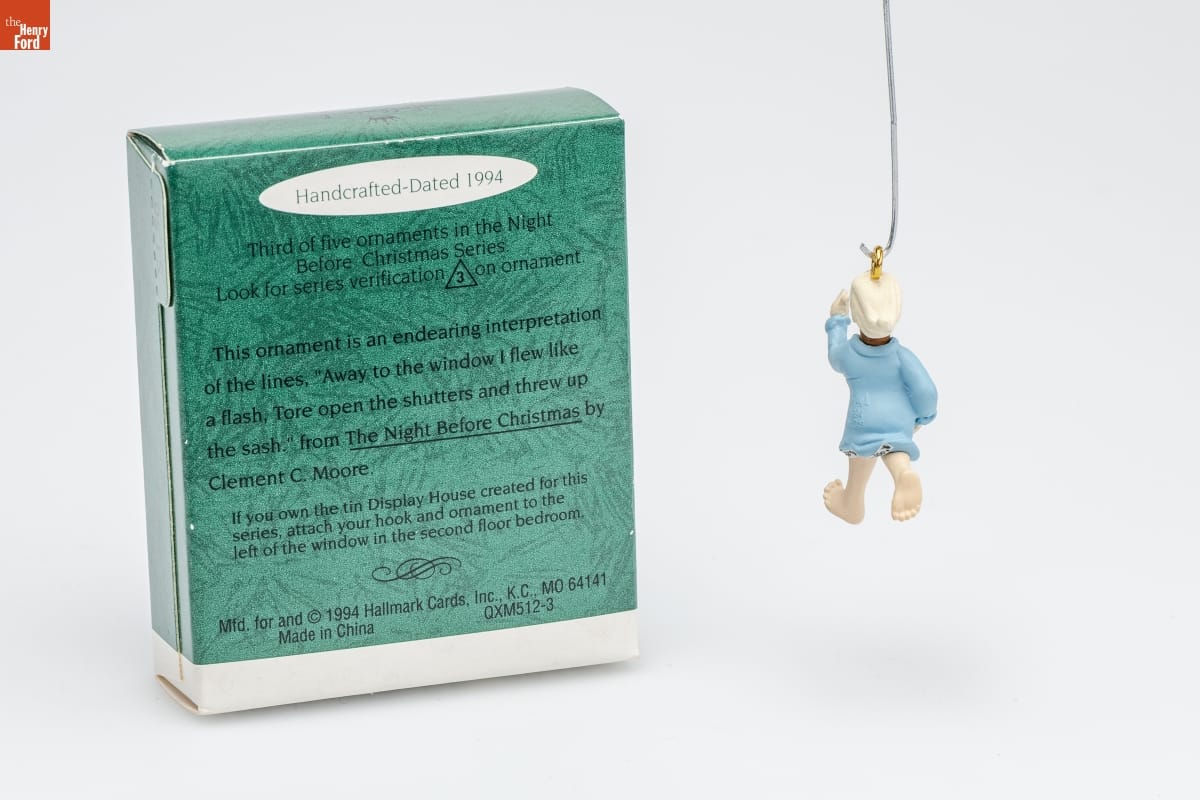 Handcrafted - Dated 1994 / Third of five ornaments in the / Night / Before Christmas Series. / Look for series verification 3 on ornament. / This ornament is an endearing interpretation / of the lines, "Away to the window I flew like / a flash, Tore open the shutters and threw up / the sash," from The Night Before Christmas by / Clement C. Moore. / If you own the tin Display House created for this / series, attach your hook and ornarment to the / left of the window in the second floor bedroom. / Mfd. for and (C) 1994 Hallmark Cards, Inc., K.C., MO 64141 / Made in China QXM512-3