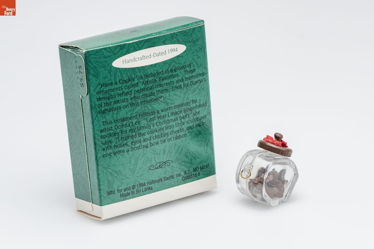 Handcrafted - Dated 1994 / "Have a Cookie" is included in a group of / ornaments called "Artists' Favorites." These / designs reflect personal interests and memories / of the artists who create them. Look for Donna's / signature on this ornament. / This ornament reflects a warm memory for / artist Donna Lee. "Last year I made gingerbread / cookies for my family's Christmas party," she / says. "I turned the cookies into little sculptures / with noses, eyes and chubby cheeks, and each / one wore a frosting bow tie of ribbon." / Mfd. for and (C) 1994 Hallmark Cards, Inc., K.C., MO 64141 / Made in Sri Lanka QXM516-6