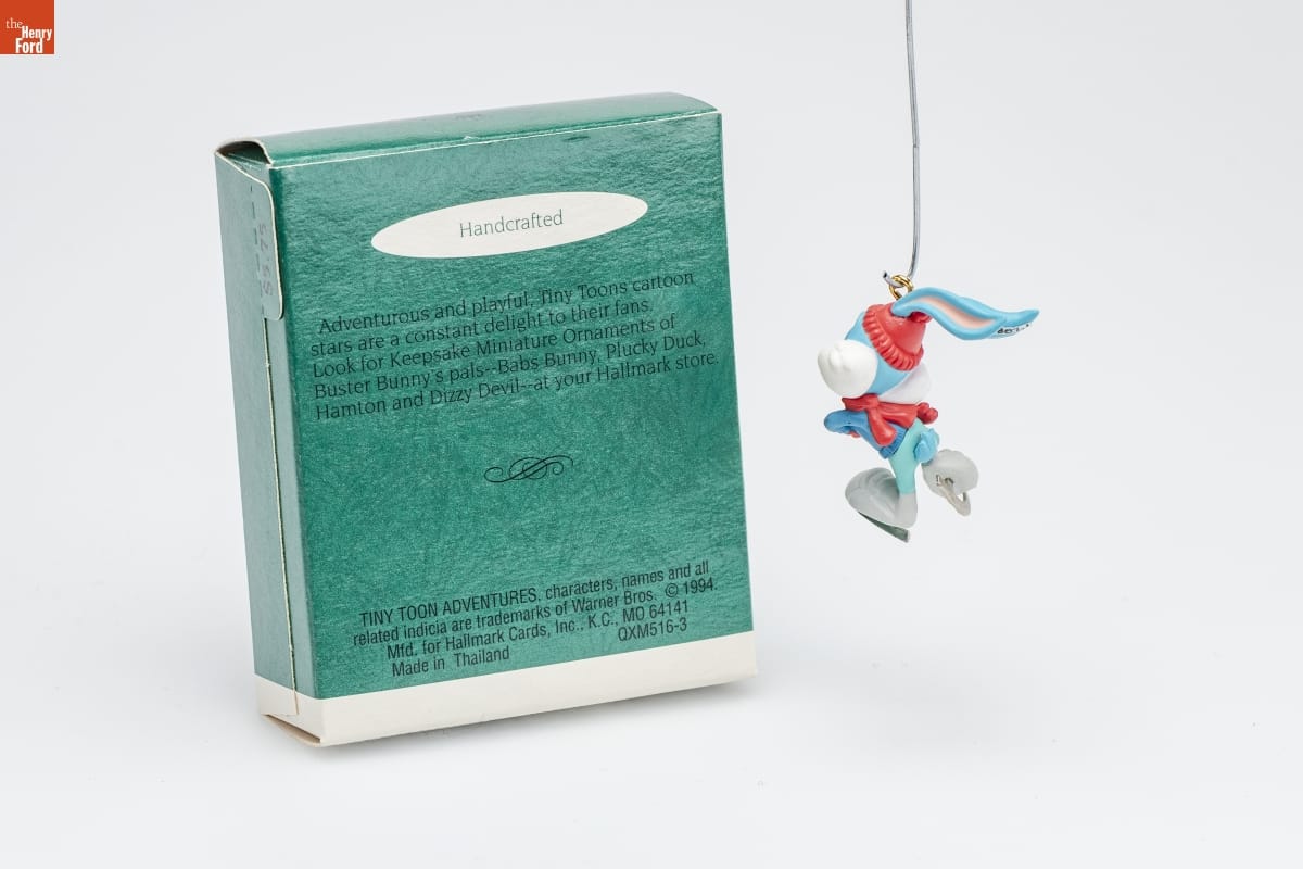 Handcrafted / Adventurous and playful, Tiny Toons cartoon / stars are a constant delight to their fans. / Look for Keepsake Miniature Ornaments of / Buster Bunny's pals--Babs Bunny, Plucky Duck, / Hamton and Dizzy Devil--at your Hallmark store. / TINY TOON ADVENTURES, characters, names and all / related indicia are trademarks of Warner Bros. (C) 1994 / Mfd. for Hallmark Cards, Inc., K.C., MO 64141 / Made in Thailand QXM516-3