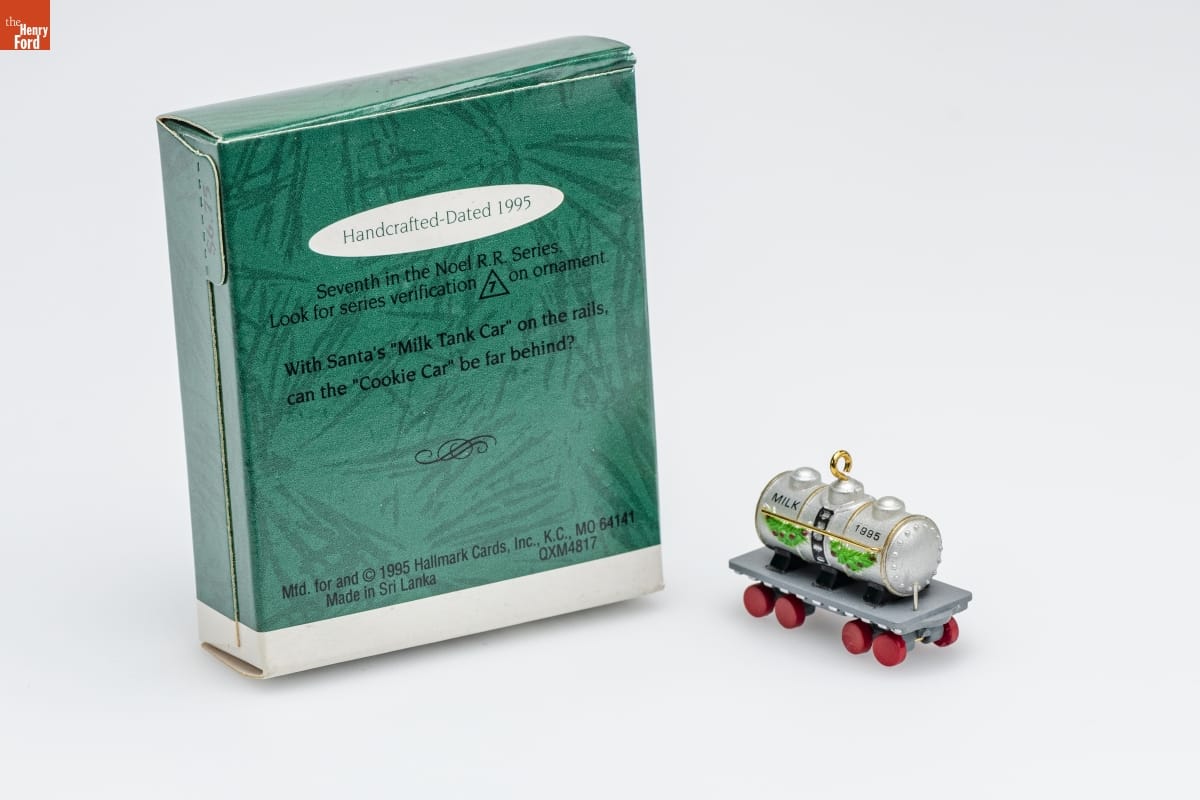 Handcrafted - Dated 1995 / Seventh in the Noel R.R. Series. / Look for series verification 7 on ornament. / With Santa's "Milk Tank Car" on the rails, / can the "Cookie Car" be far behind? / Mfd. for and (C) 1995 Hallmark Cards, Inc., K.C., MO 64141 / Made in Sri Lanka QXM4817