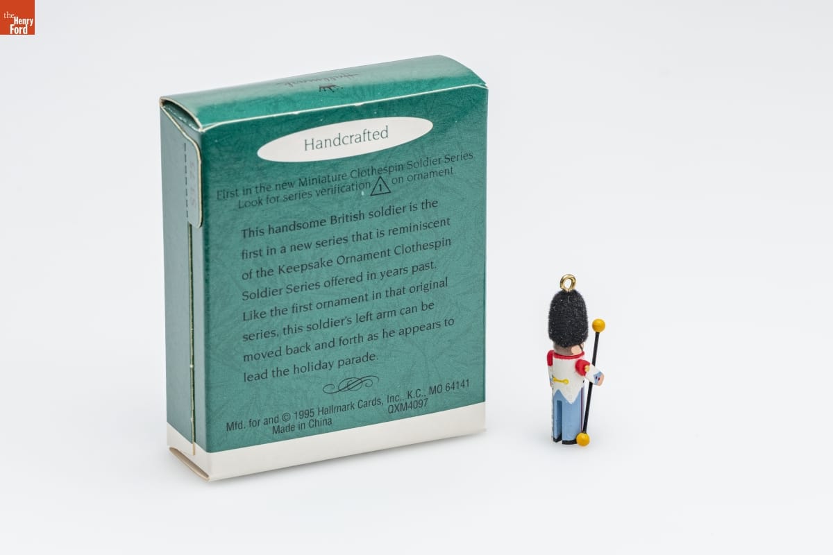 Handcrafted / First in the new Miniature Clothespin Soldier Series. / Look for series verification 1 on ornament. / This handsome British soldier is the / first in a new series that is reminiscent / of the Keepsake Ornament Clothespin / Soldier Series offered in years past. / Like the first ornament in that original / series, this soldier's left arm can be / moved back and forth as he appears to / lead the holiday parade. / Mfd. for and (C) 1995 Hallmark Cards, Inc., K.C., MO 64141 / Made in China QXM4097