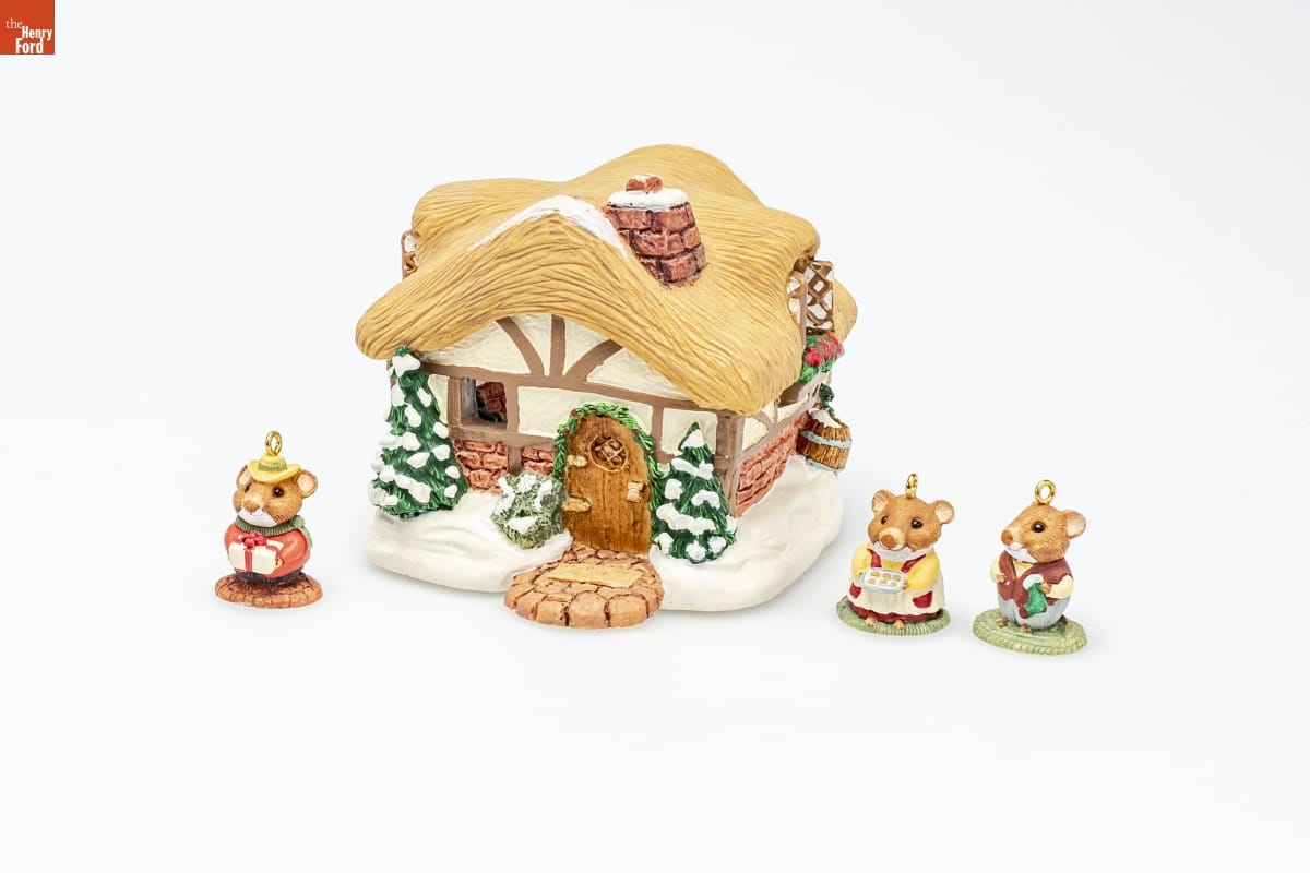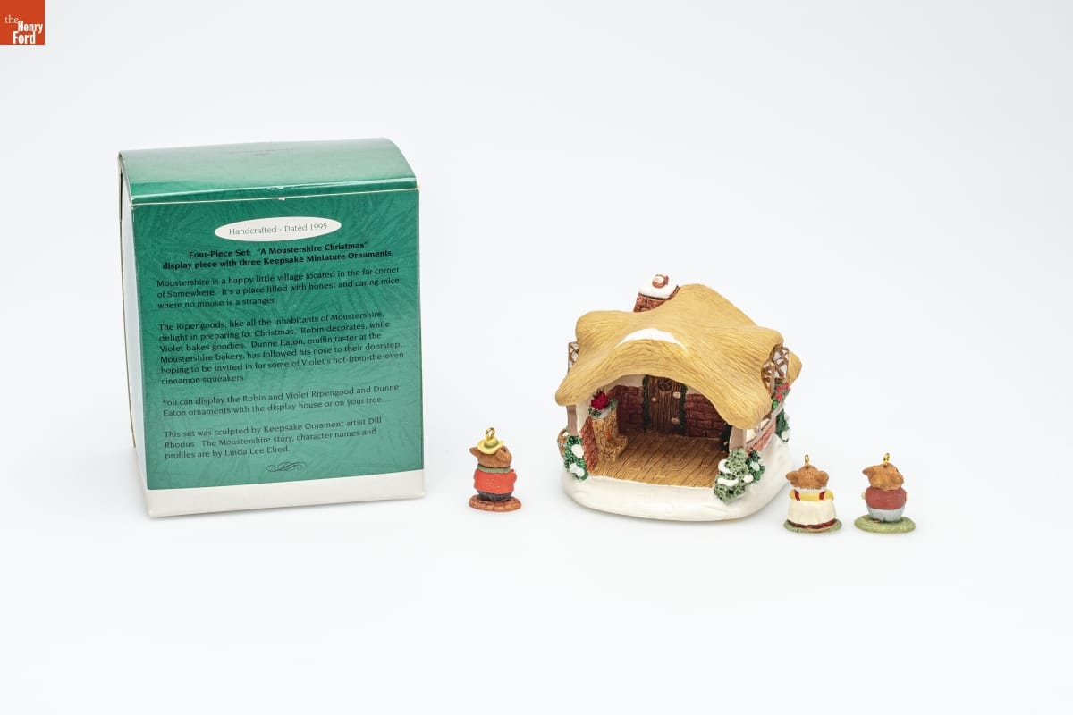Handcrafted - Dated 1995 / Four-Piece Set: "A Moustershire Christmas" / display piece with three Keepsake Miniature Ornaments. / Moustershire is a happy little village located in the far corner / of Somewhere. It's a place filled with honest and caring mice / where no mouse is a stranger. / The Rippengoods, like all the inhabitants of Moustershire, / delight in preparing for Christmas. Robin decorates, while / Violet bakes goodies. Dunne Eaton, muffin taster at the / Moustershire bakery, has followed his nose to their doorstep, / hoping to be invited in for some of Violet's hot-from-the-oven / cinnamon squeakers. / You can display the Robin and Violet Ripengood and Dunne / Eaton ornaments with the display house or on your tree. / This set was sculpted by Keepsake Ornament artist Dill / Rhodus. The Moustershire story, character names and / profiles are by Linda Lee Elrod.