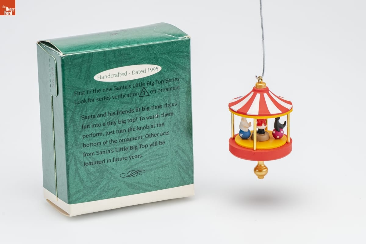 Handcrafted - Dated 1995 / First in the new Santa's Little Big Top Series. / Look for series verification 1 on ornament. / Santa and his friends fit big-time circus / fun into a tiny big top! To watch them / perform, just turn the knob at the / bottom of the ornament. Other acts / from Santa's Little Big Top will be / featured in future years.