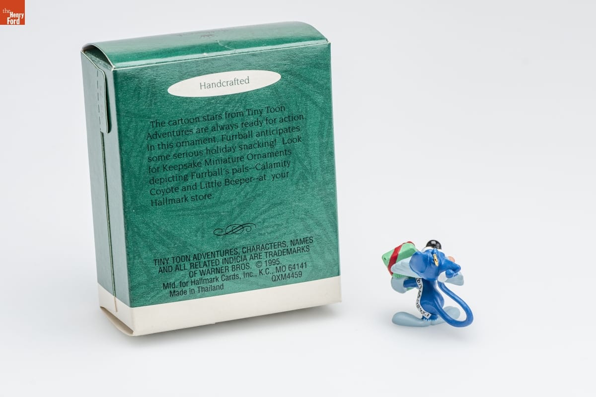 Handcrafted / The cartoon stars from Tiny Toon / Adventures are always ready for action. / In this ornament, Furrball anticipates / some serious holiday snacking! Look / for Keepsake Miniature Ornaments / depicting Furrball's / pals--Calamity Coyote and Little Beeper--at your / Hallmark store. / TINY TOON ADVENTURES, CHARACTERS, NAMES / AND ALL RELATED INDICIA ARE TRADEMARKS / OF WARNER BROS. (C) 1995 / Mfd. for Hallmark Cards, Inc., K.C., MO 64141 / Made in Thailand QXM4459