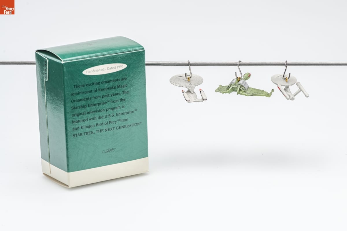 Handcrafted - Dated 1995 / These exciting ornaments are / reminiscent of Keepsake Magic / Ornaments from past years. The / Starship Enterprise TM from the / original television program is / featured with the U.S.S. Enterprise TM / and Klingon Bird of Prey TM from STAR TREK: THE NEXT GENERATION (R).