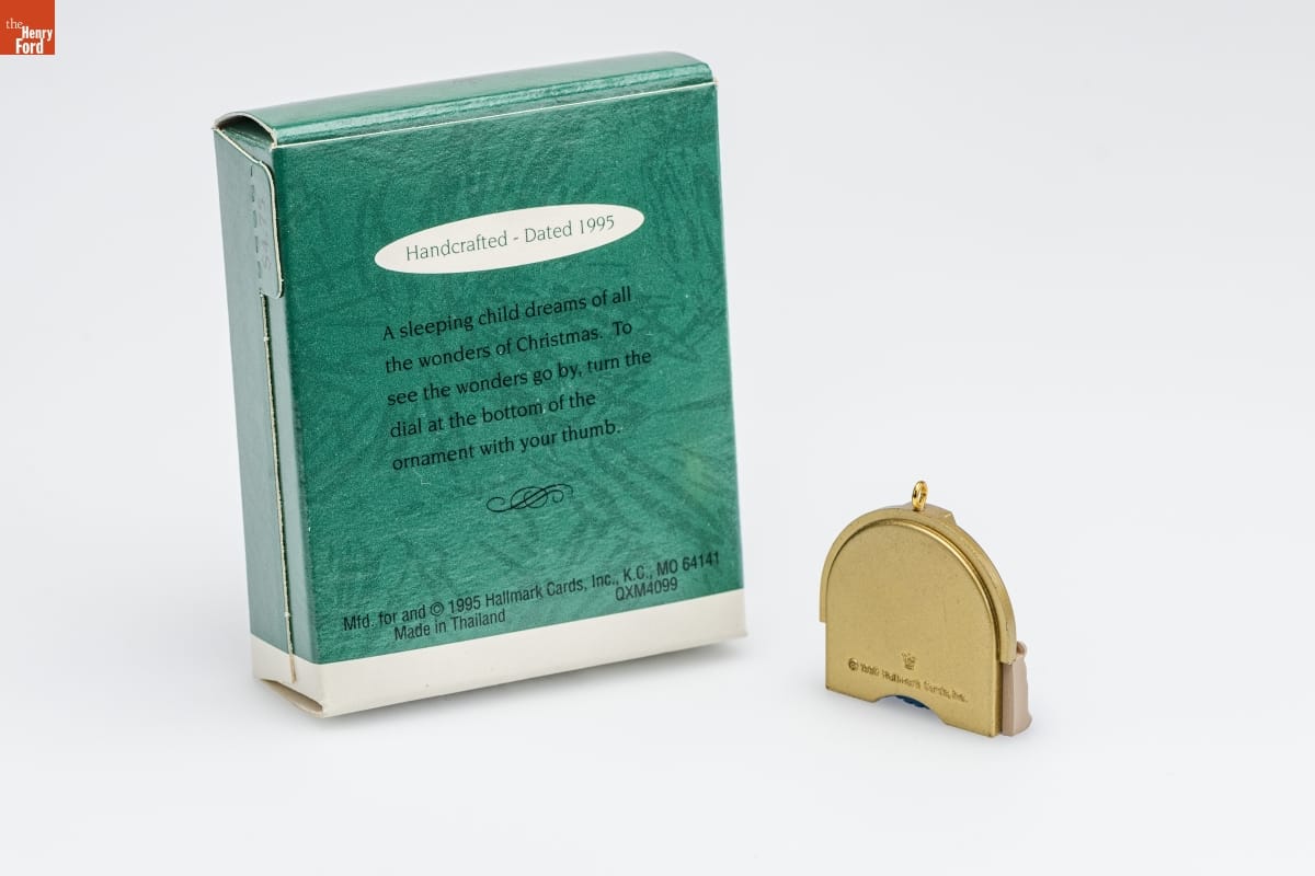 Handcrafted - Dated 1995 / A sleeping child dreams of all / the wonders of Christmas. To / see the wonders go by, turn the / dial at the bottom of the / ornament with your thumb. / Mfd. for and (C) 1995 Hallmark Cards, Inc., K.C., MO 64141 / Made in Thailand QXM4099