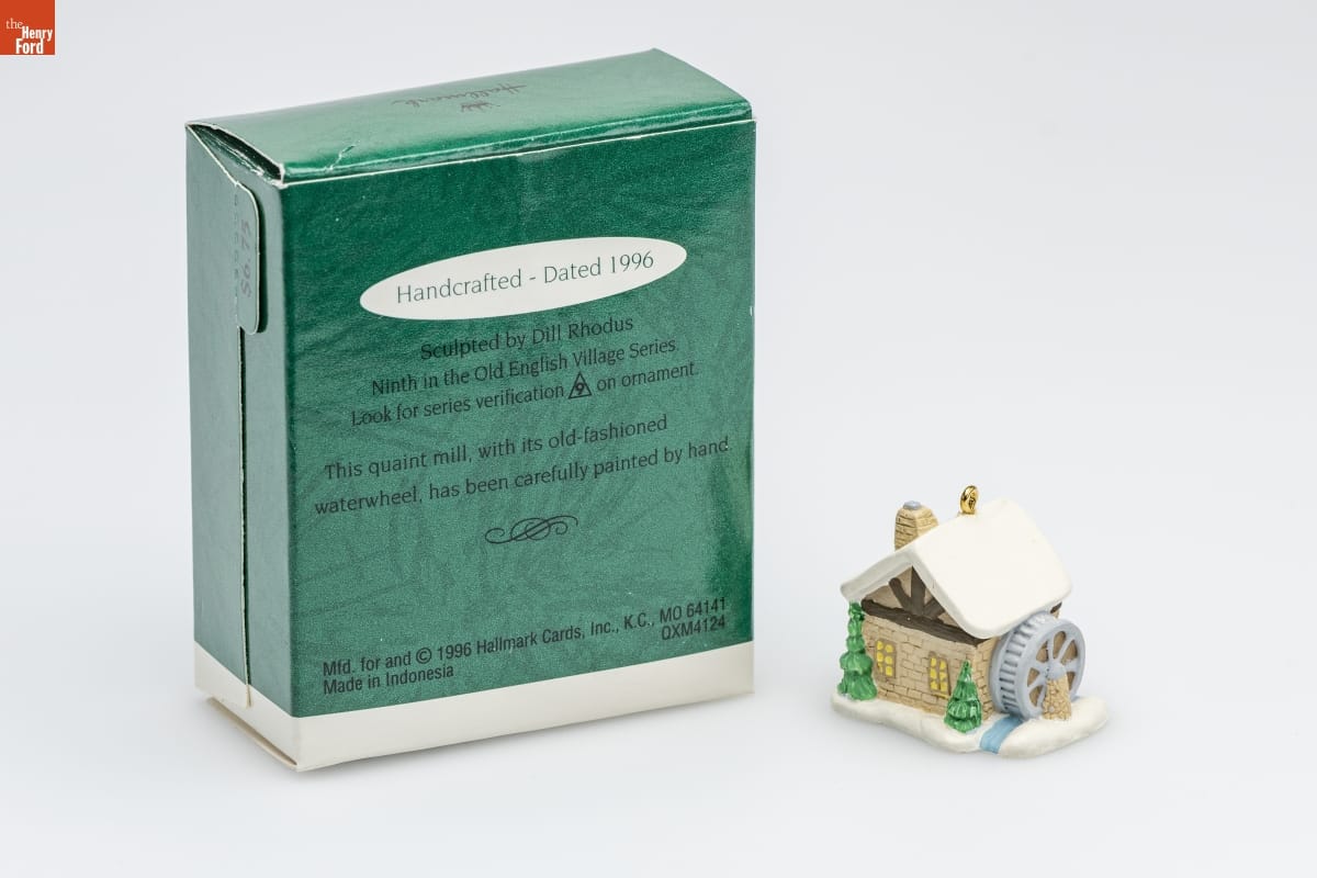 Handcrafted - Dated 1996 / Sculpted by Dill Rhodus / Ninth in the Old English Village Series. / Look for series verification 9 on ornament. / This quaint mill, with its old-fashioned / waterwheel, has been carefully painted by hand. / Mfd. for and (C) 1996 Hallmark Cards, Inc., K.C., MO 64141 / Made in Indonesia QXM4124