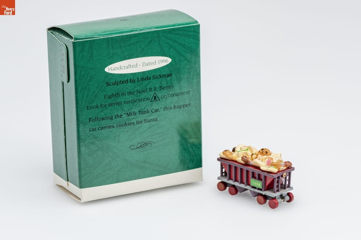 Handcrafted - Dated 1996 / Sculpted by Linda Sickman / Eighth in the Noel R.R. Series. / Look for series verification 8 on ornament. / Following the "Milk Tank Car," this hopper / car carries cookies for Santa.