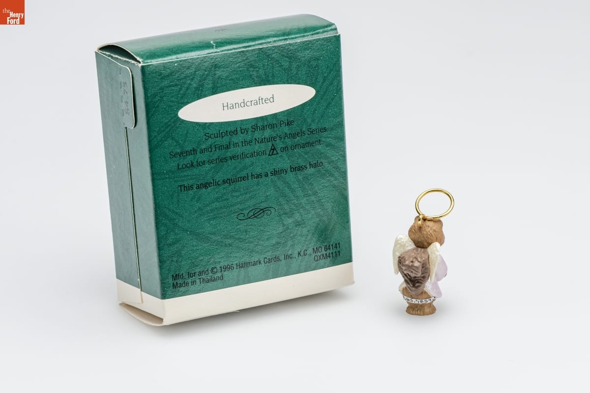 Handcrafted / Sculpted by Sharon Pike / Seventh and Final in the Nature's Angels Series. / Look for series verification 7 on ornament. / This angelic squirrel has a shiny brass halo. / Mfd. for and (C) 1996 Hallmark Cards, Inc., K.C., MO 64141 / Made in Thailand QXM4111