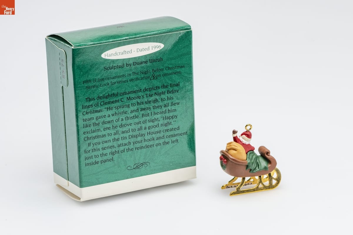 Handcrafted - Dated 1996 / Sculpted by Duane Unruh / Fifth of five ornaments in The Night Before Christmas / Series. Look for series verification 5 on ornament. / This delightful ornament depicts the final / lines of Clement C. Moore's The Night Before / Christmas: "He sprang to his sleigh, to his / team gave a whistle, and away they all flew / like the down of a thistle. But I heard him / exclaim, ere he drove out of sight, "Happy / Christmas to all, and to all a good night." / If you own the tin Display House created / for this series, attach your hook and ornament / just to the right of the reindeer on the left / inside panel.