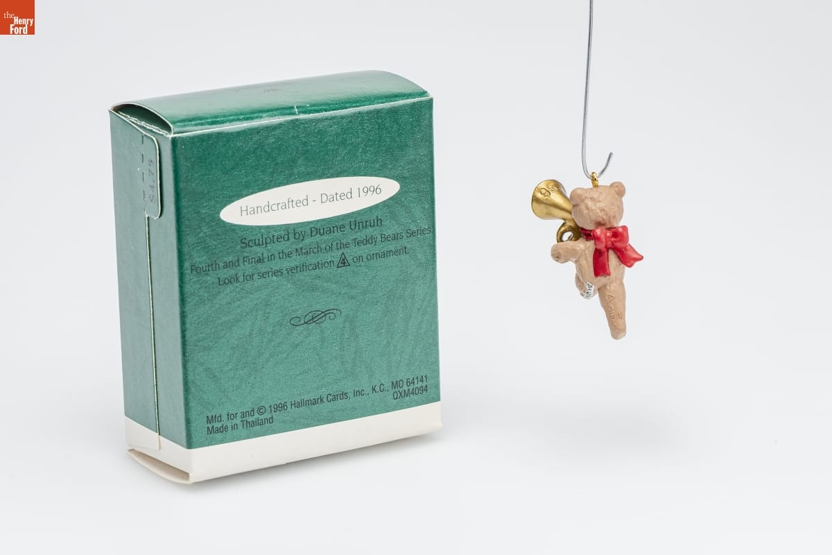 Handcrafted - Dated 1996 / Sculpted by Duane Unruh / Fourth and Final in the March of the Teddy Bears Series. Look for series verification 4 on ornament. / Mfd. for and (C) 1996 Hallmark Cards, Inc., K.C., MO 64141 / Made in Thailand QXM4094