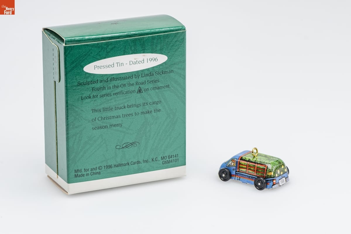 Pressed Tin - Dated 1996 / Sculpted and illustrated by Linda Sickman. / Fourth in the On the Road Series. / Look for series verification 4 on ornament. / This little truck brings its cargo / of Christmas trees to make the / season merry. / Mfd. for and (C) 1996 Hallmark Cards, Inc., K.C., MO 64141 / Made in China QXM4101