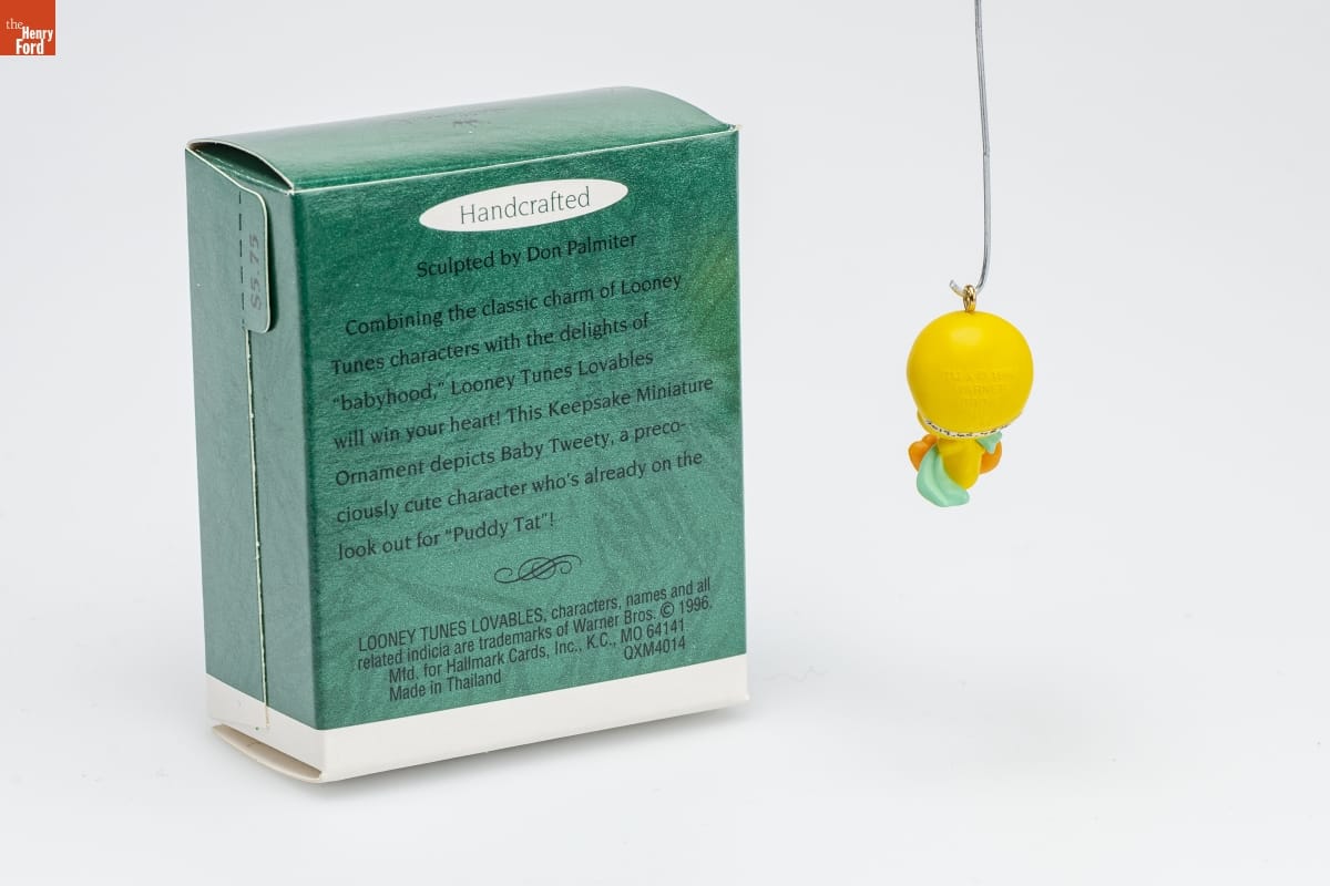 Handcrafted / Sculpted by Don Palmiter / Combining the classic charm of Looney / Tunes characters with the delights of / "babyhood," Looney Tunes Loveables / will win your heart! This Keepsake Miniature / Ornament depicts Baby Tweety, a preco- / ciously cute character who's already on the / look out for "Puddy Tat"! / LOONEY TUNES LOVABLES, characters, names and all / related indicia are trademarks of Warner Bros. (C) 1996 / Mfd. for Hallmark Cards, Inc., K.C., MO 64141 / Made in Thailand QXM4014
