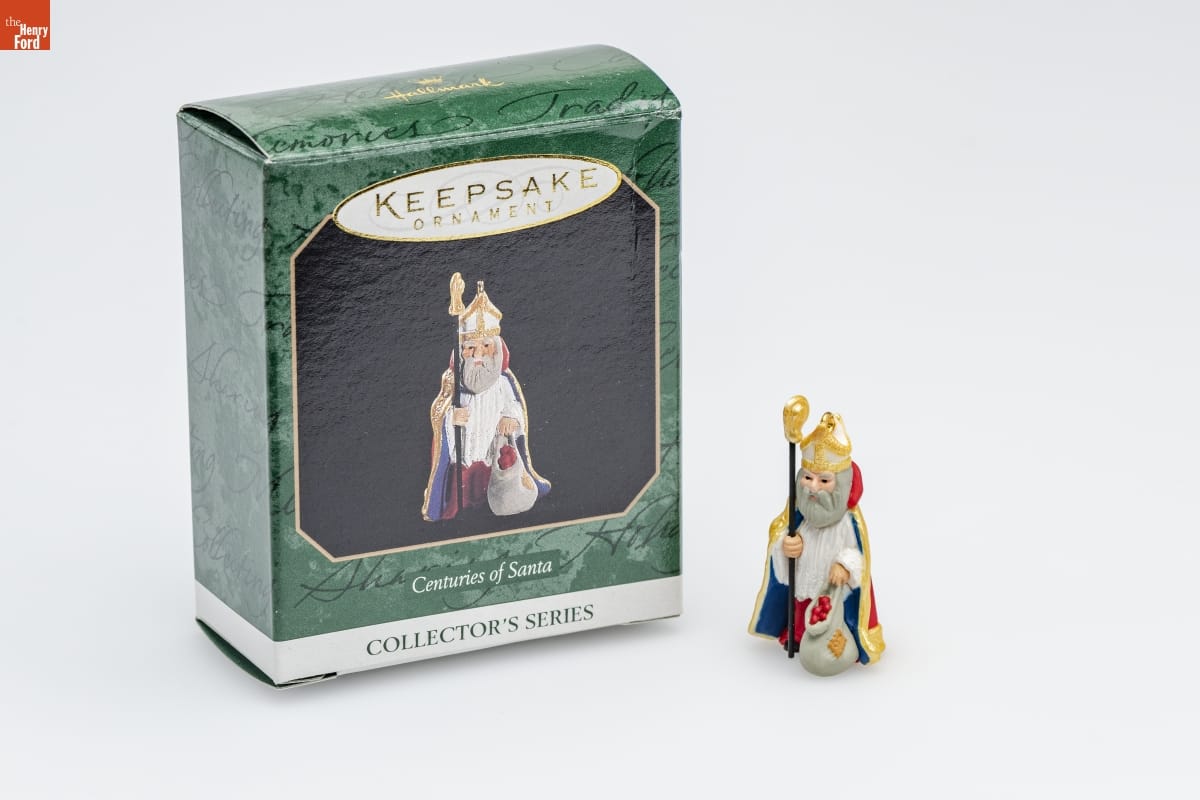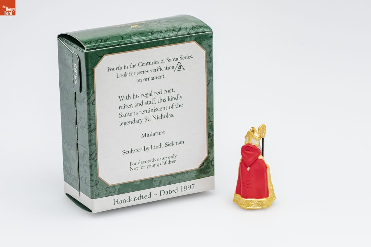 Fourth in the Centuries of Santa Series. / Look for series verification 4 / on ornament. / With his regal red coat, / miter, and staff, this kindly / Santa is reminiscent of the / legendary St. Nicholas. / Sculpted by Linda Sickman / Miniature / For decorative use only. / Not for young children. / Handcrafted - Dated 1997