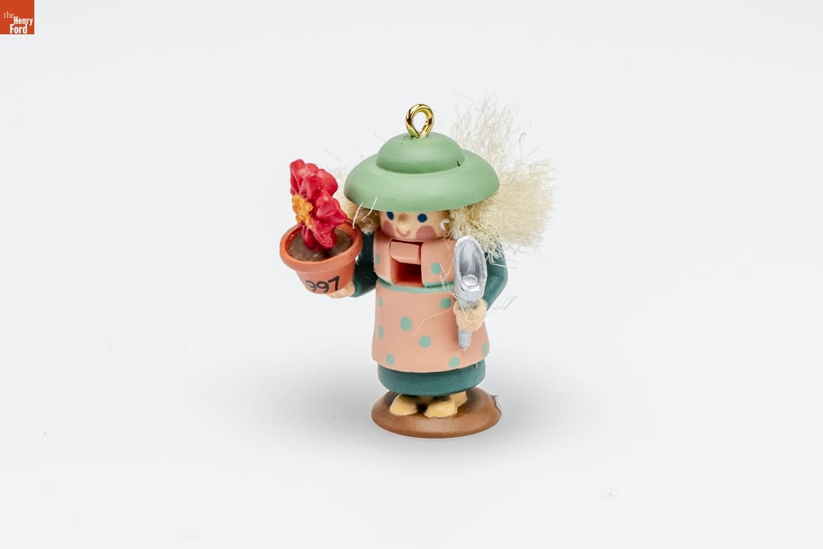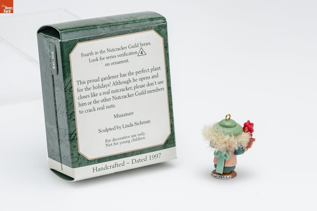 Fourth in the Nutcracker Guild Series. / Look for series verification 4 / on ornament. / This proud gardener has the perfect plant / for the holidays! Although he opens and / closes like a real nutcracker, please don't use / him or the other Nutcracker Guild members / to crack real nuts. / Miniature / Sculpted by Linda Sickman / For decorative use only. / Not for young children. / Handcrafted - Dated 1997