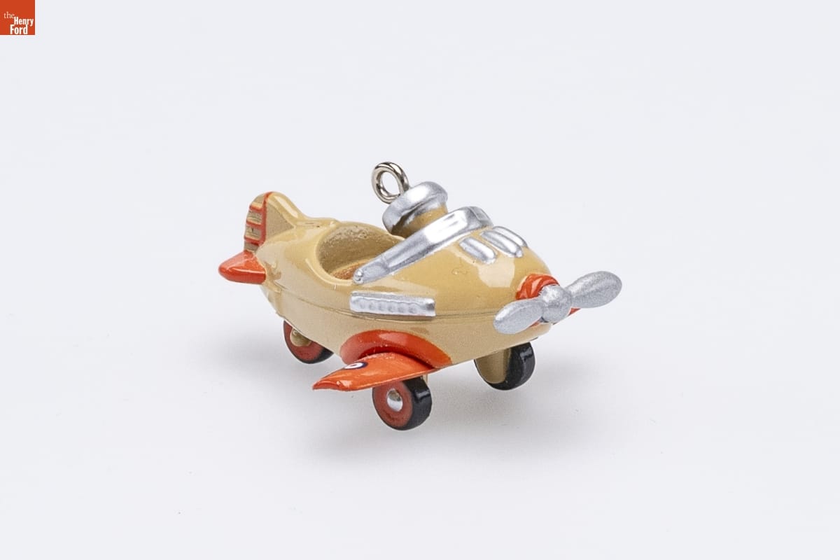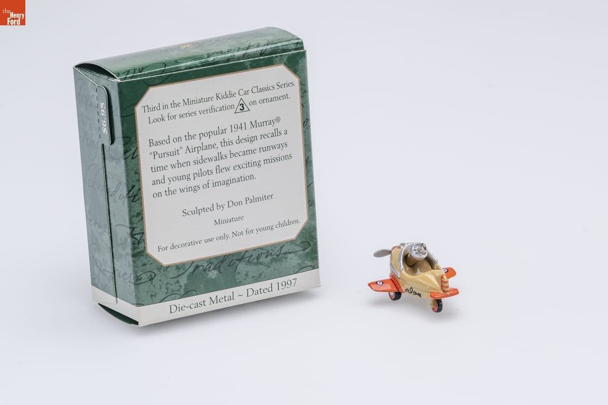Third in the Miniature Kiddie Car Classics Series. / Look for series verification 3 on ornament. / Based on the popular 1941 Murray(R) / "Pursuit" Airplane, this design recalls a / time when sidewalks became runways / and young pilots flew exciting missions / on the wings of imagination. / Sculpted by Don Palmiter / Miniature / For decorative use only. Not for young children. / Die-cast Metal - Dated 1997