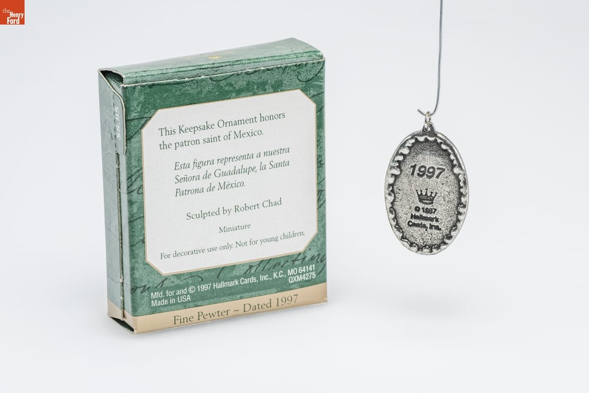 This Keepsake Ornament honors / the patron saint of Mexico. / Esta figura representa a nuestra / Senora de Guadalupe, la Santa / Patrona de Mexico. / Sculpted by Robert Chad / Miniature / For decorative use only. Not for young children. / Mfd. for and (C) 1997 Hallmark Cards, Inc., K.C., MO 64141 / Made in USA QXM4275 / Fine Pewter - Dated 1997