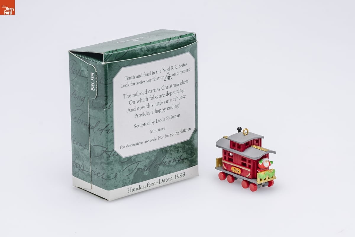 Tenth and final in the Noel R.R. Series. / Look for series verification 10 on ornament. / The railroad carries Christmas cheer / On which folks are depending / And now this little cute caboose / Provides a happy ending! / Sculpted by Linda Sickman / Miniature / For decorative use only. Not for young children. / Handcrafted - Dated 1998