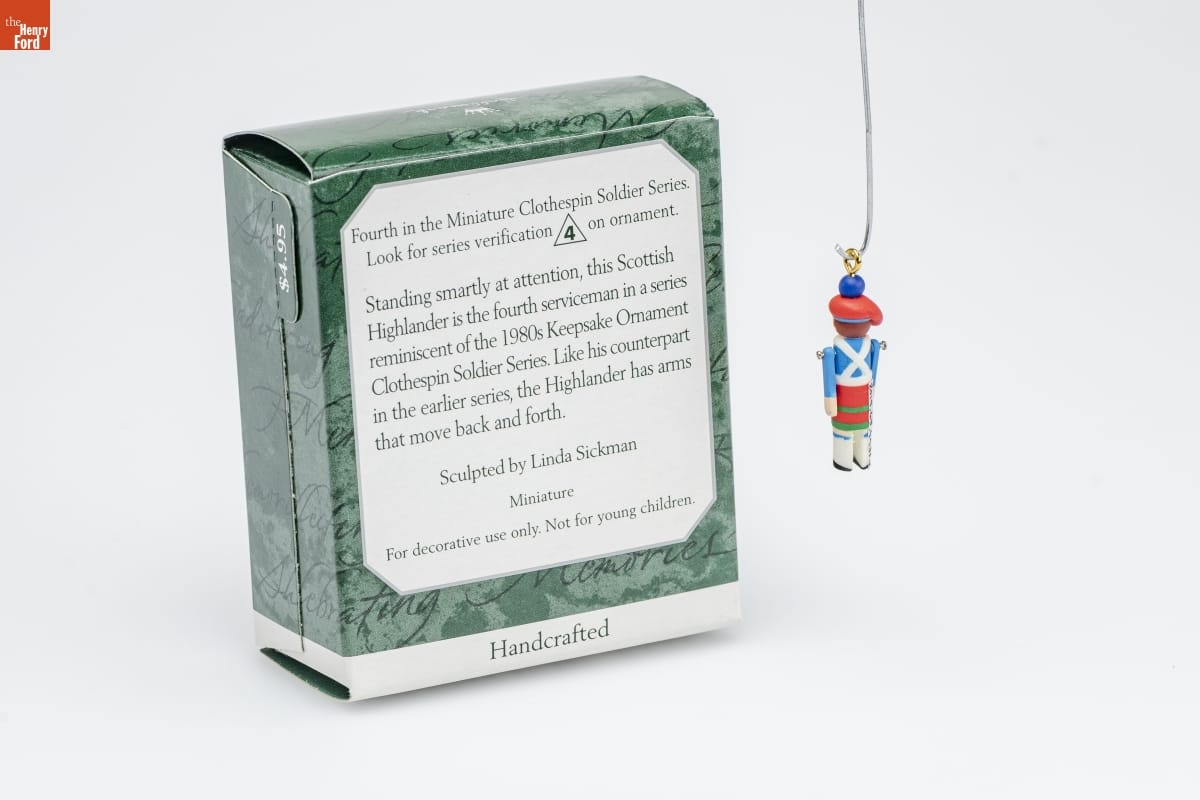 Fourth in the Miniature Clothespin Soldier Series. / Look for series verification 4 on ornament. / Standing smartly at attention, this Scottish / Highlander is the fourth serviceman in a series / reminiscent of the 1980s Keepsake Ornament / Clothespin Soldier Series. Like his counterpart / in the earlier series, the Highlander has arms / that move back and forth. / Sculpted by Linda Sickman / Miniature / For decorative use only. Not for young children. / Handcrafted