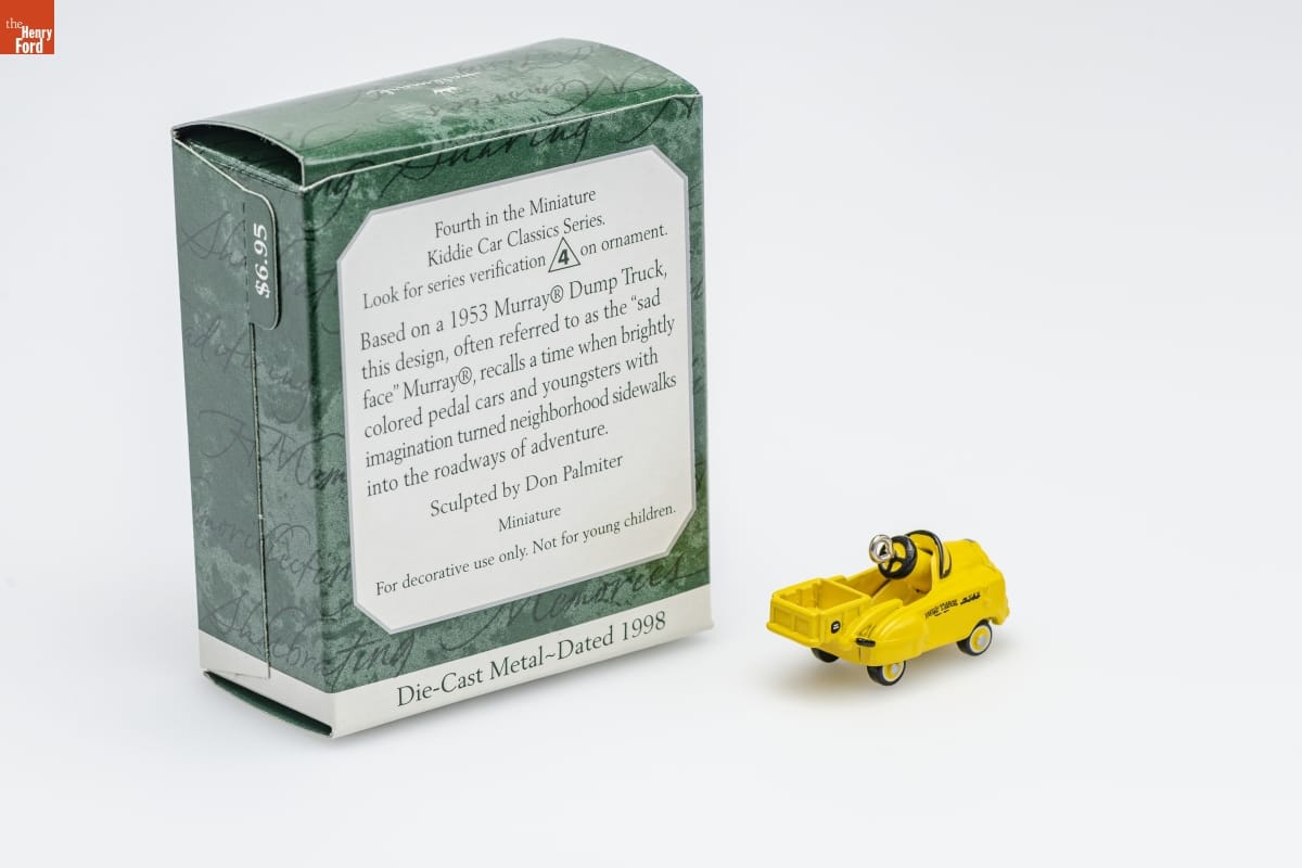 Fourth in the Miniature / Kiddie Car Classics Series. / Look for series verification 4 on ornament. / Based on a 1953 Murray(R) Dump Truck, / this design, often referred to as the "sad / face" Murray(R), recalls a time when brightly / colored pedal cars and youngsters with / imagination turned neighborhood sidewalks / into the roadways of adventure. / Sculpted by Don Palmiter / Miniature / For decorative use only. Not for young children. / Die-Cast Metal - Dated 1998