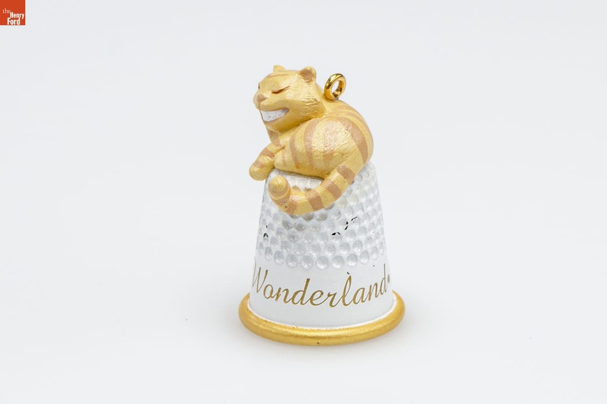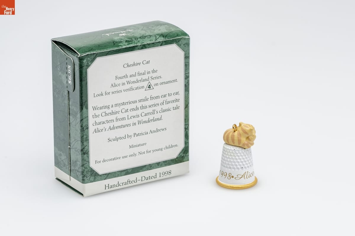 Cheshire Cat / Fourth and final in the / Alice in Wonderland Series. / Look for series verification 4 on ornament. / Wearing a mysterious smile from ear to ear, / the Cheshire Cat ends this series of favorite / characters from Lewis Carroll's classic tale / Alice's Adventures in Wonderland. / Sculpted by Patricia Andrews / Miniature / For decorative use only. Not for young children. / Handcrafted - Dated 1998