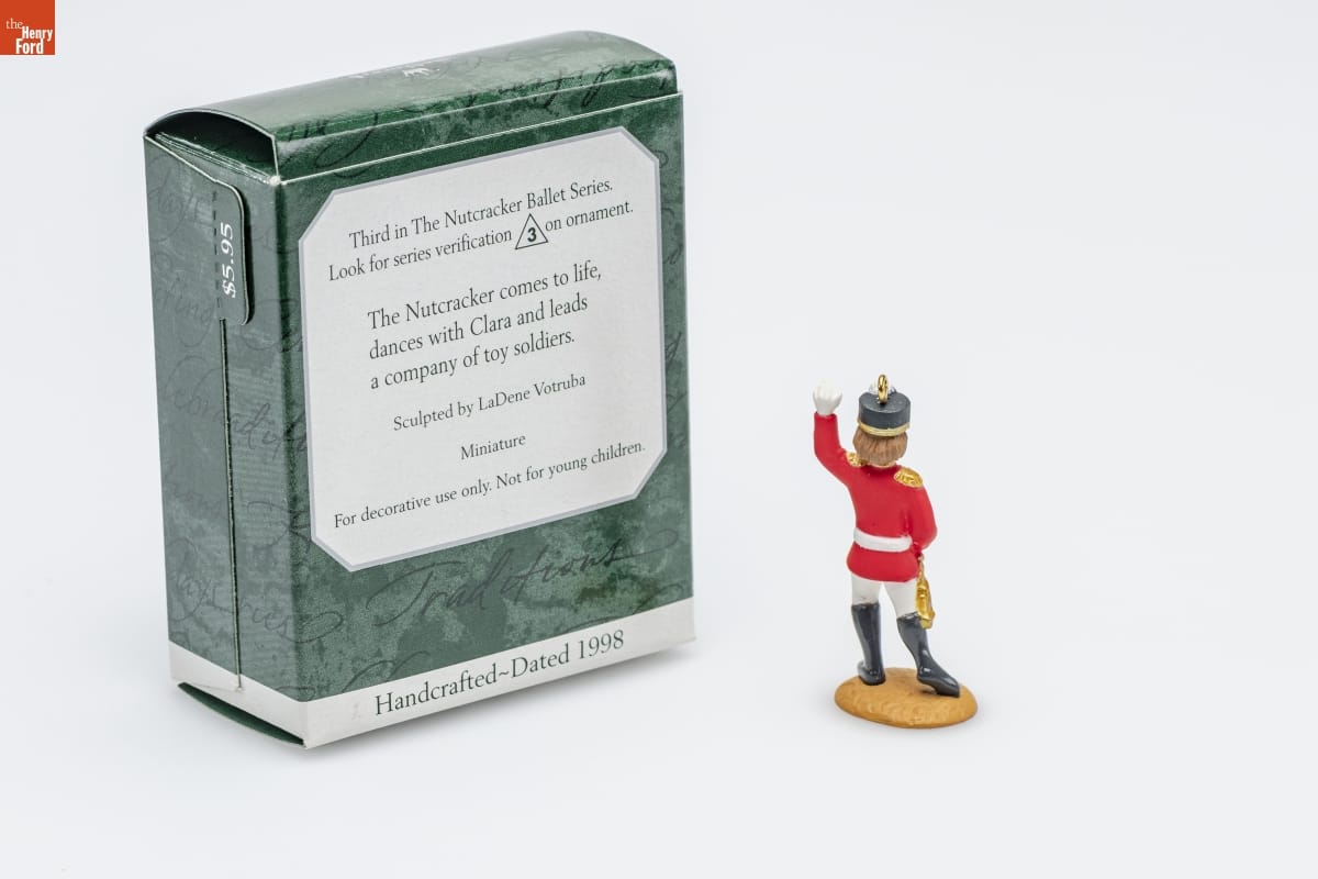Third in The Nutcracker Ballet Series. / Look for series verification 3 on ornament. / The Nutcracker comes to life, / dances with Clara and leads / a company of toy soldiers. / Sculpted by LaDene Votruba / Miniature / For decorative use only. Not for young children. / Handcrafted - Dated 1998