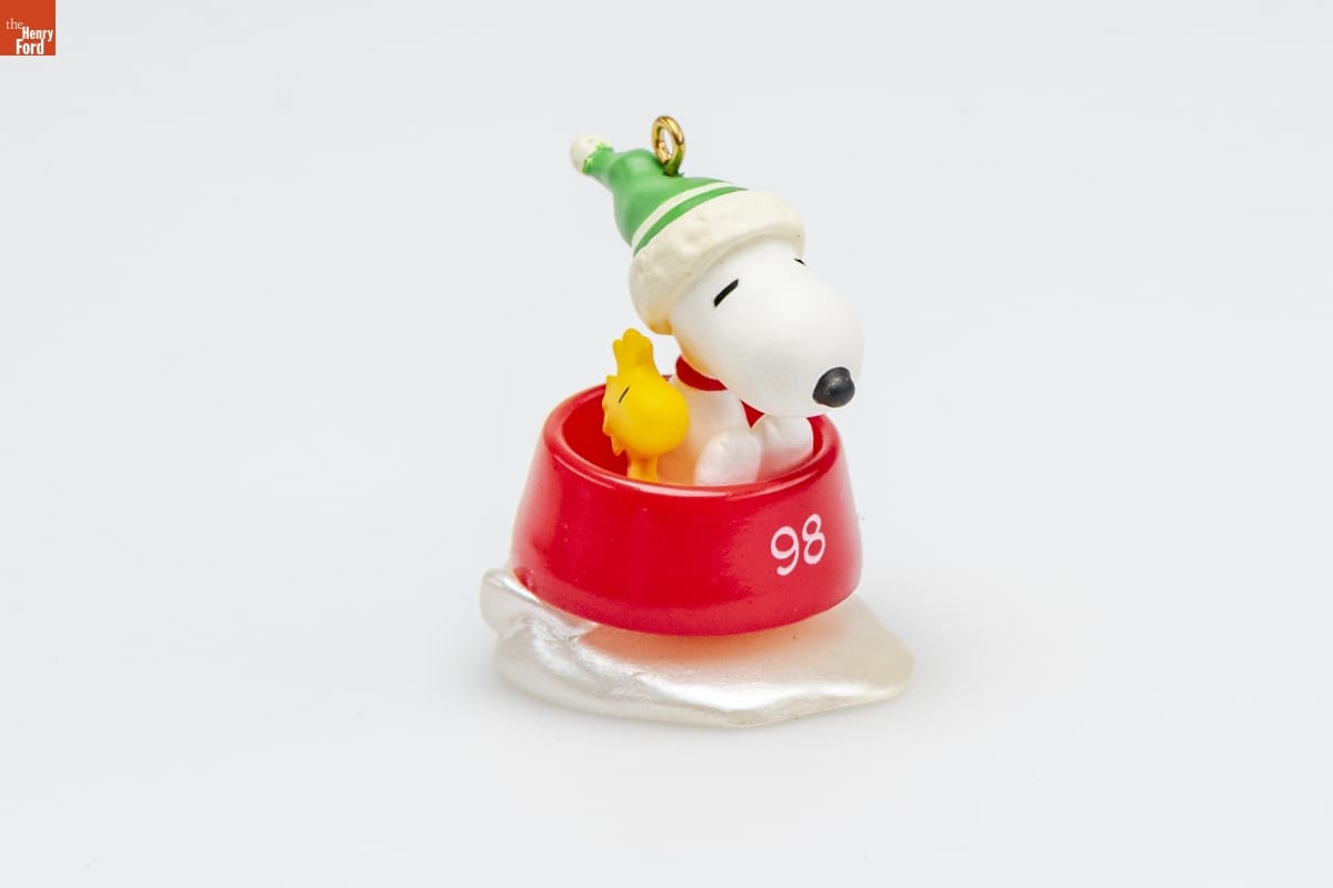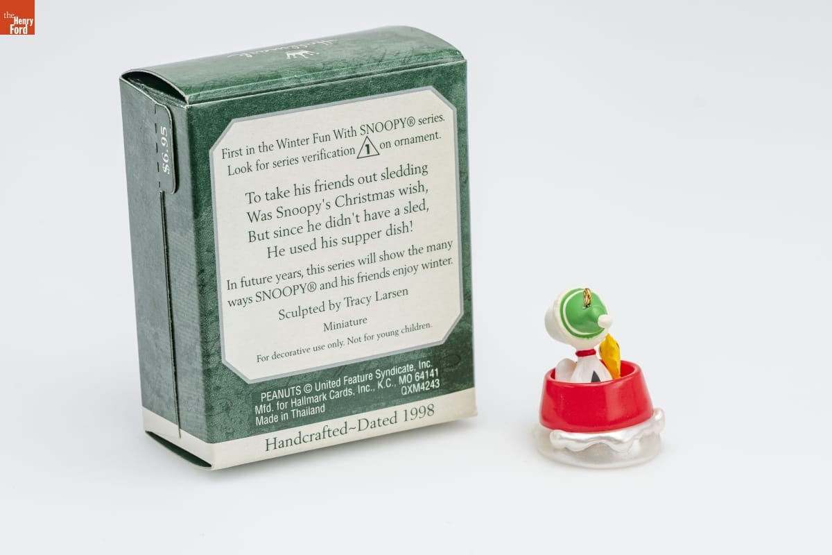 First in the Winter Fun With SNOOPY(R) Series. / Look for series verification 1 on this ornament. / To take his friends out sledding / Was Snoopy's Christmas wish, / But since he didn't have a sled, / He used his supper dish! / In future years, this series will show the many / ways SNOOPY(R) and his friends enjoy winter. / Sculpted by Tracy Larsen / Miniature / For decorative use only. Not for young children. / PEANUTS(R) United Feature Syndicate, Inc. / Mfd. for Hallmark Cards, Inc., K.C., MO 64141 / Made in Thailand QXM4243 / Handcrafted - Dated 1998