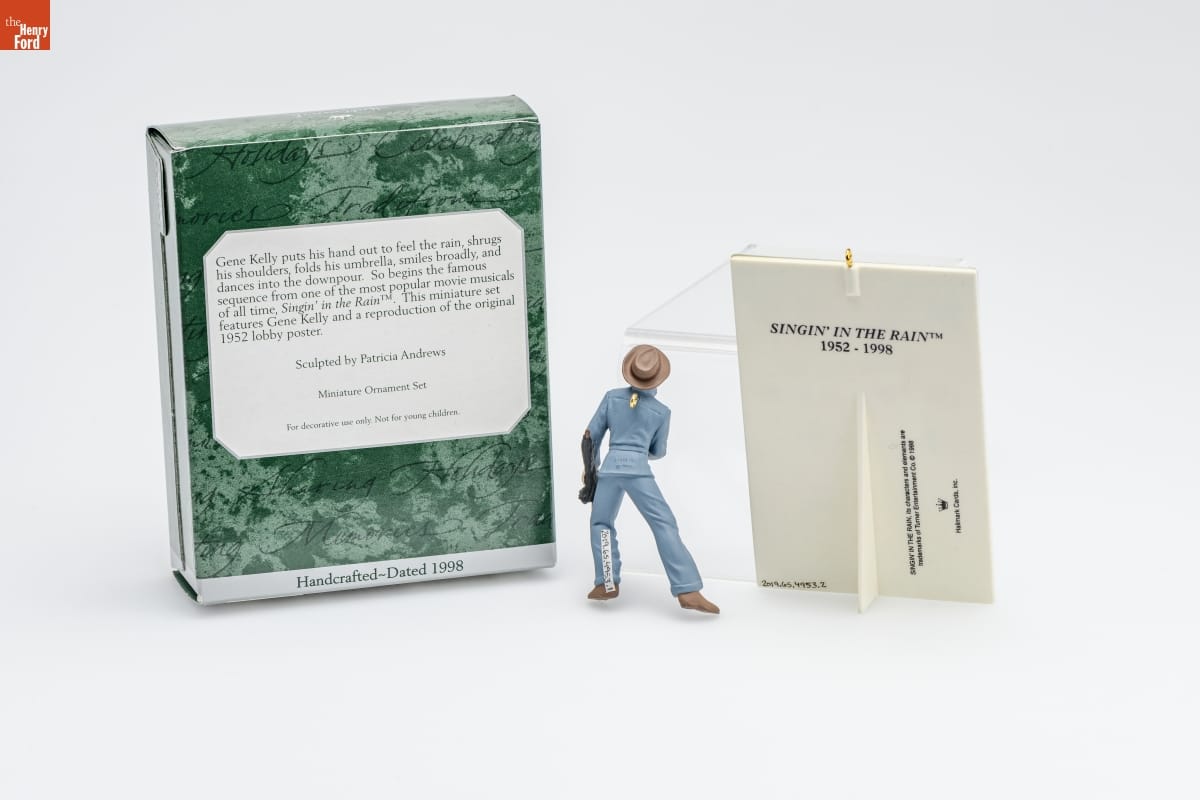 Gene Kelly puts his hand out to feel the rain, shrugs, his shoulders, folds his umbrella, smiles broadly, and / dances into the downpour. So begins the famous / sequence from one of the most popular movie musicals / of all time, Singin' in the Rain TM. This miniature set / features Gene Kelly and a reproduction of the original / 1952 lobby poster. / Sculpted by Patricia Andrews / Miniature Ornament Set / For decorative use only. Not for young children. / Handcrafted - Dated 1998