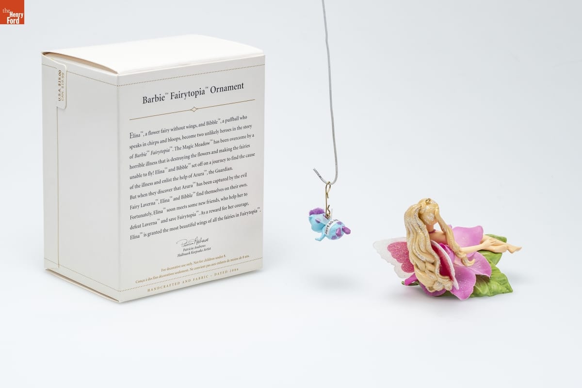 Barbie TM Fairytopia TM Ornament / Elina TM, a flower fairy without wings, and Bibble TM, a puffball who / speaks in chirps and bloops, become two unlikely heroes in the story / of Barbie TM Fairytopia TM. The Magic Meadow TM has been overcome by a / horrible illness that is destroying the flowers and making the fairies / unable to fly! Elina TM and Bibble TM set off on a journeyto find the cause / of the illness and enlist the help of Azura TM, the Guardian. / But when they discover that Azura TM has been captured by the evil / Fairy Laverna TM, Elina TM and Bibble TM find themselves on their own. / Fortunately, Elina TM soon meets some new friends, who help her to / defeat Laverna TM and save Fairytopia TM. As a reward for her courage, / Elina TM is grated the most beautiful wings of all the fairies in Fairytopia TM. / Patricia Andrews / Hallmark Keepsake Artist / For decorative use only. Not for children under 8. / Concu a des fins decoratives seulement. Ne convient pas aux enfants de moins de 8 ans. / HANDCRAFTED AND FABRIC - DATED 2006
