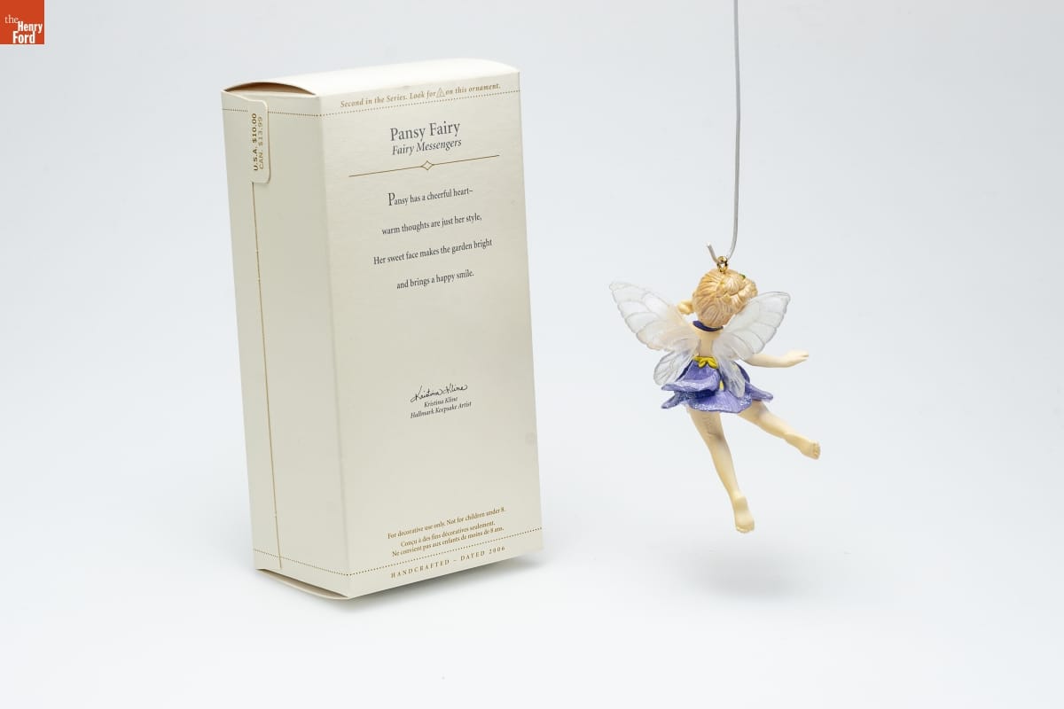 Second in the Series. Look for 2 on this ornament. / Pansy Fairy / Fairy Messengers / Pansy has a cheerful heart-- / warm thoughts are just her style, / Her sweet face makes the garden bright / and brings a happy smile. / Kristina Kline / Hallmark Keepsake Artist / For decorative use only. Not for children under 8. / Concu a des fins decoratives seulement. / Ne convient pas aux enfants de moins de 8 ans. / HANDCRAFTED - DATED 2006