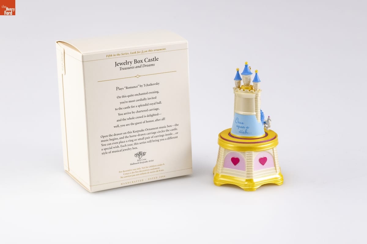 Fifth in the Series. Look for 5 on this ornament. / Jewelry Box Castle / Treasures and Dreams / Plays "Romance" by Tchaikovsky / On this quite enchanted evening, / you're most cordially invited / to the castle for a splendid royal ball. / You arrive by chartered carriage, / and the whole crowd is delighted-- / well, you are the guest of honor, after all! / Open the drawer on thsi Keepsake Ornament music box--the / music begins, and the horse-drawn carriage circles the castle. / You can even place a ring or small pair of earrings inside...or / a special wish. Each year, this series will bring you a different / style of musical jewelry box. / Ken Crow / Hellmark Keepsake Artist / For decorative use only. Not for children under 8. / Concu a des fins decoratives seulement. Ne convient pas aux enfants de moins de 8 ans. / HANDCRAFTED - DATED 2006