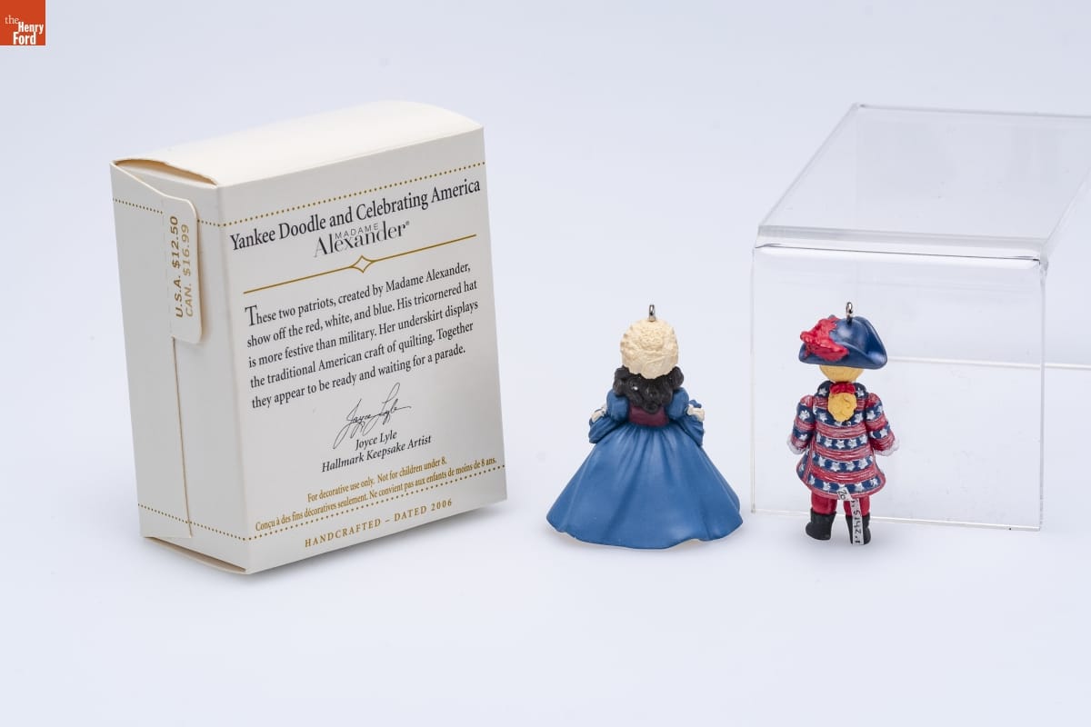 Yankee Doodle and Celebrating America / MADAME / Alexander(R) / These two patriots, created by Madame Alexander, / show off the red, white, and blue. His tricornered hat / is more festive than military. Her underskirt displays / the traditional American craft of quilting. Together / they appear to be ready and waiting for a parade. / Joyce Lyle / Hallmark Keepsake Artist / For decorative use only. Not for children under 8. / Concu a des fins decoratives seulement. Ne convient pas aux enfants de moins de 8 ans. / HANDCRAFTED - DATED 2006