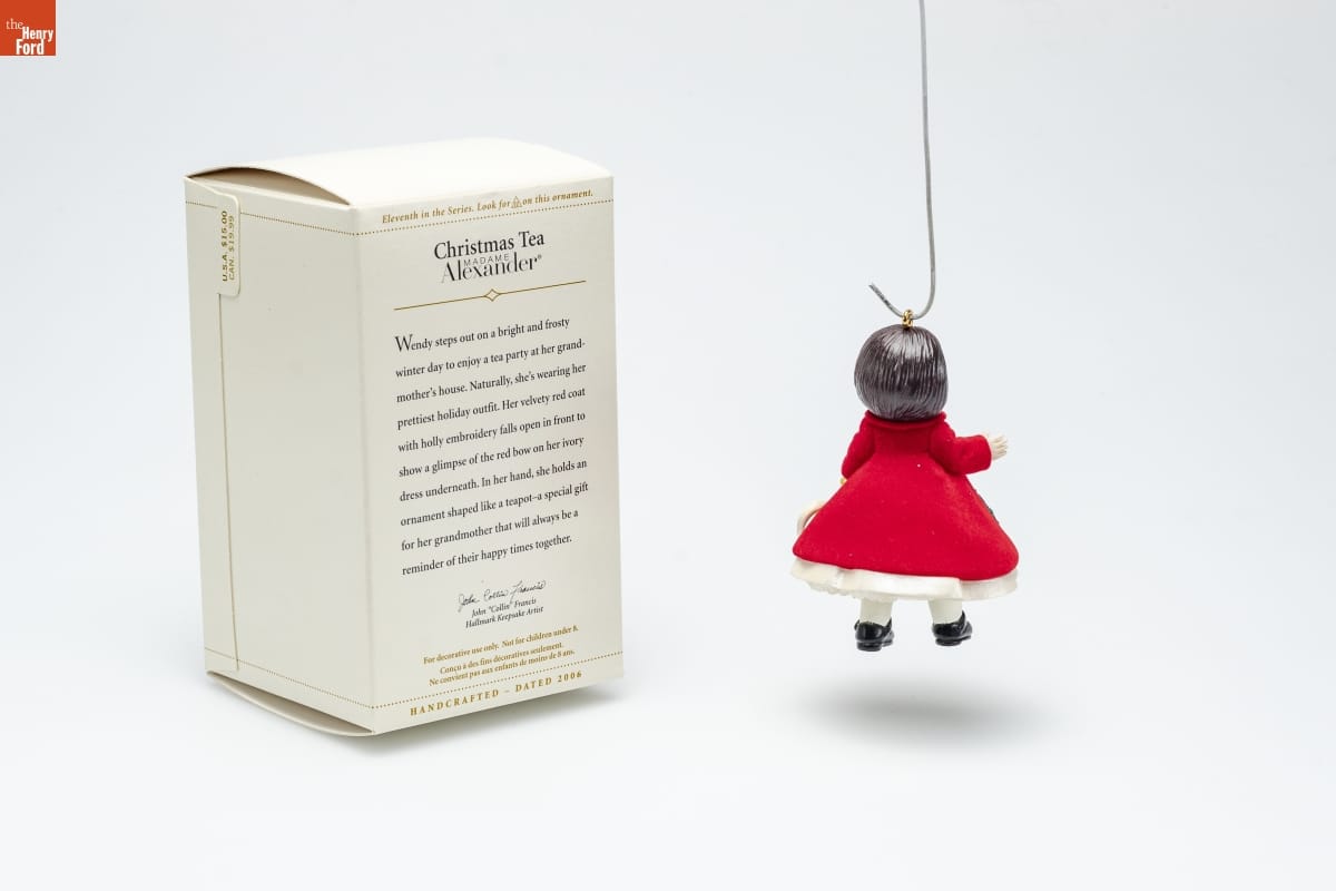 Eleventh in the Series. Look for 11 on this ornament. / Christmas Tea / MADAME / Alexander (R) / Wendy steps out on a bright and frosty / winter day to enjoy a tea party at her grand- / mother's house. Naturally, she's wearing her / prettiest holiday outfit. Her velvety red coat / with holly embroidery falls open in front to / show a glimpse of the red bow oh her ivory / dress underneath. In her hand, she holds an / ornament shaped like a teapot--a special gift / for her grandmother that will always be a / reminder of their happy times together. / John "Collin" Francis / Hallmark Keepsake Artist / For decorative use only. Not for children under 8. / Concu a des fins decoratives seulement. / Ne convient pas aux enfants de moins de 8 ans. / HANDCRATED - DATED 2006