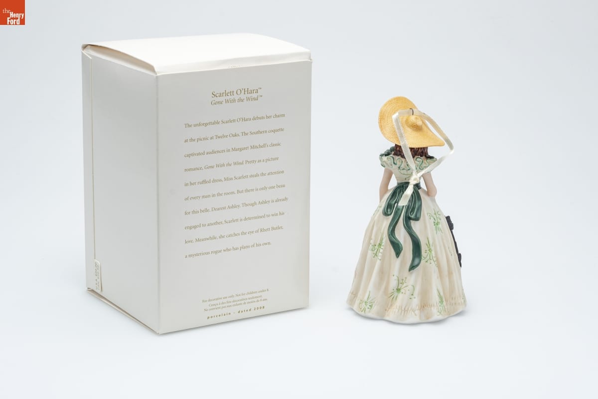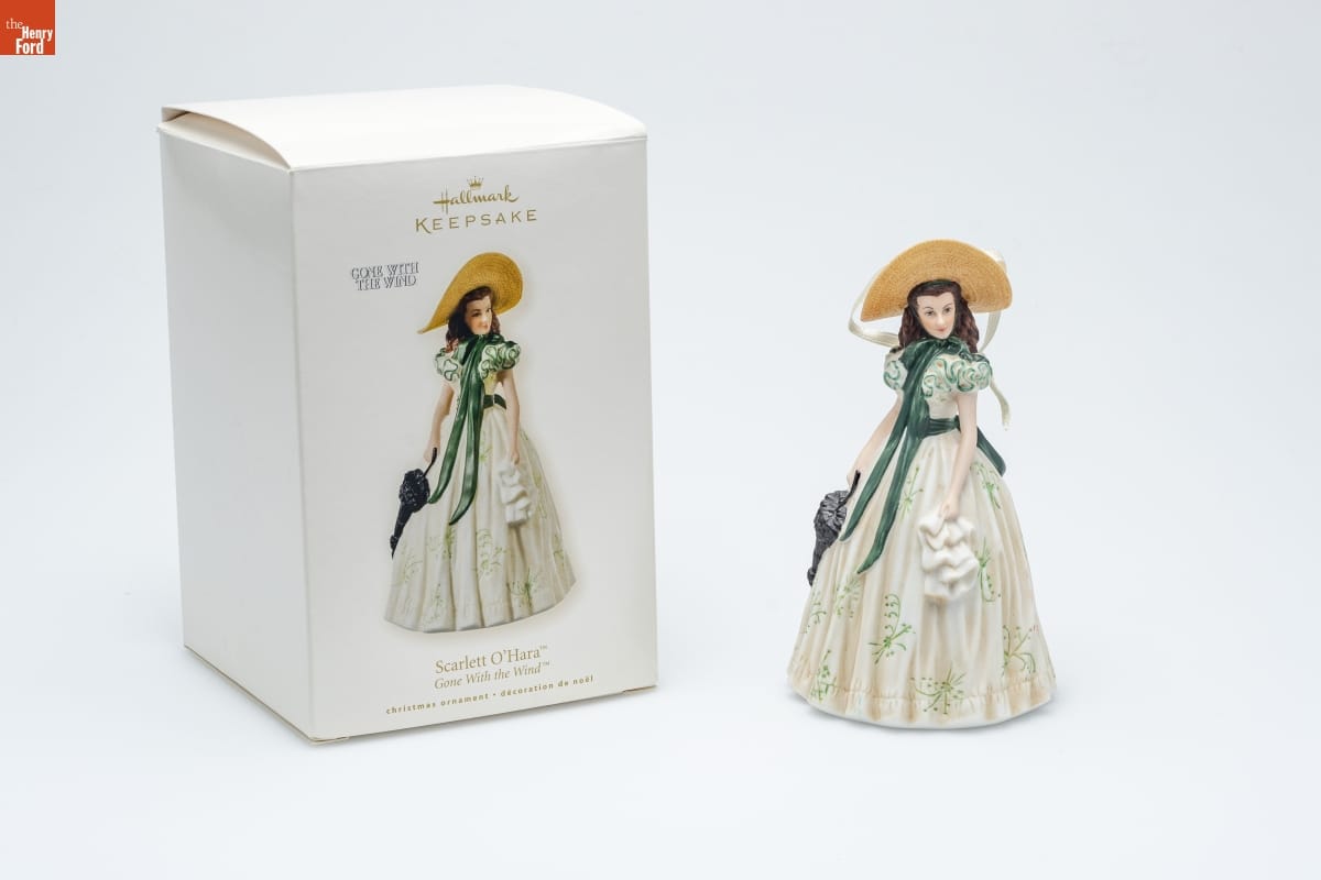 on bottom of ornament: 2008 / TM Turner Entertainment Co. & The Stephens Mitchell Trusts. / (C) Turner Entertainment Co. (s08) / Hallmark Cards, Inc. on front of packaging: Hallmark / KEEPSAKE / GONE WITH / THE WIND / Scarlett O'Hara TM / Gone With the Wind TM / christmas ornament decoration de noel on back of packaging: Scarlett O'Hara TM / Gone With the Wind TM / The unforgettable Scarlett O'Hara debuts her charm / at the picnic at Twelve Oaks. The Southern coquette / captivated audiences in Margaret Mitchell's classic / romance, Gone With the Wind. Pretty as a picture / in her ruffled dress, Miss Scarlett steals the attention / of every man in the room. But there is only one beau / for this belle, Dearest Ashley. Though Ashley is already / engaged to another, Scarlett is determined to win his / love. Meanwhile, she catches the eye of Rhett Butler, / a mysterious rogue who has plans of his own. / For decorative use only. Not for children under 8. / Concu a des fin decoratives seulement. / Ne convient pas aux enfants de moins de 8 ans. / porcelain - dated 2008 on bottom of packaging: WB / TM Turner Entertainment Co. & The Stephens Mitchell / Trusts. (C) Turner Entertainment Co. / WB SHIELD: TM & (C) Warner Bros. Entertainment Inc. / (s08) / www.warnerbros.com / Mfd. for/Fabrique pour Hallmark Cards, Inc. / Kansas City, MO 64141 / Made in China QXI4134