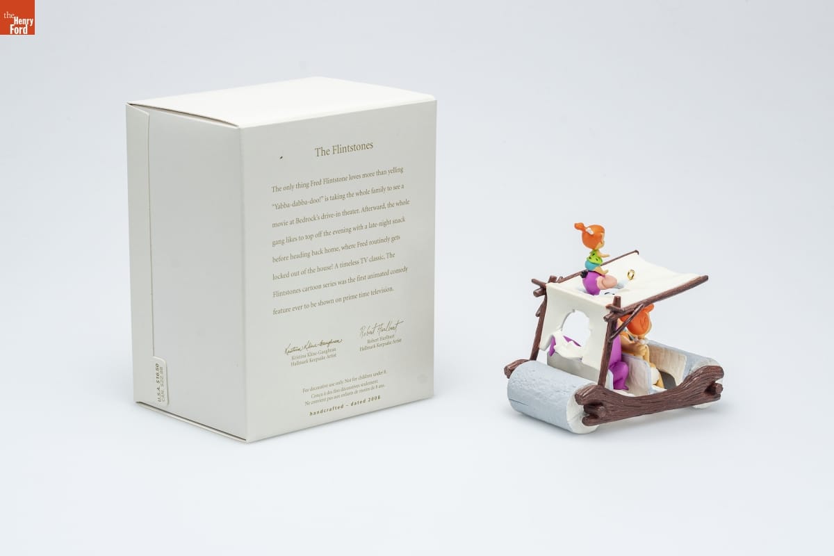 The Flintstones / The only thing Fred Flintstone loves more than yelling / "Yabba-dabba-doo!" is taking the whole family to see a / movie at Bedrock's drive-in theater. Afterward, the whole / gang likes to top off the evening with a late-night snack / before heading back home, where Fred routinely gets / locked out of the house! A timeless TV classic, The / Flintstones cartoon series was the first animated comedy / feature ever to be shown on prime time television. / Kristina Kline-Gaughran / Hallmark Keepsake Artist / Robert Hurlburt / Hallmark Keepsake Artist / For decorative use only. Not for children under 8. / Concue a des fins decoratives seulement. / Ne convient pas aux enfants de moins de 8 ans. / handcrafted - dated 2008