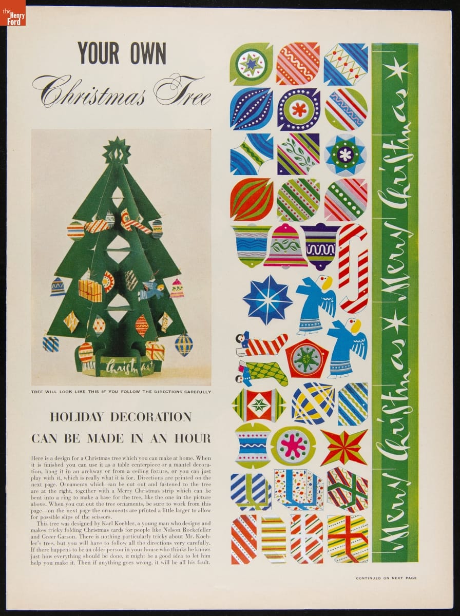 Life magazine was one of the popular documenters of American life during the mid-20th century. This December 25, 1950, Christmas issue has a special section for children. One project included a cut-out paper Christmas tree with ornaments that, if you followed the directions carefully, "can be made in an hour."