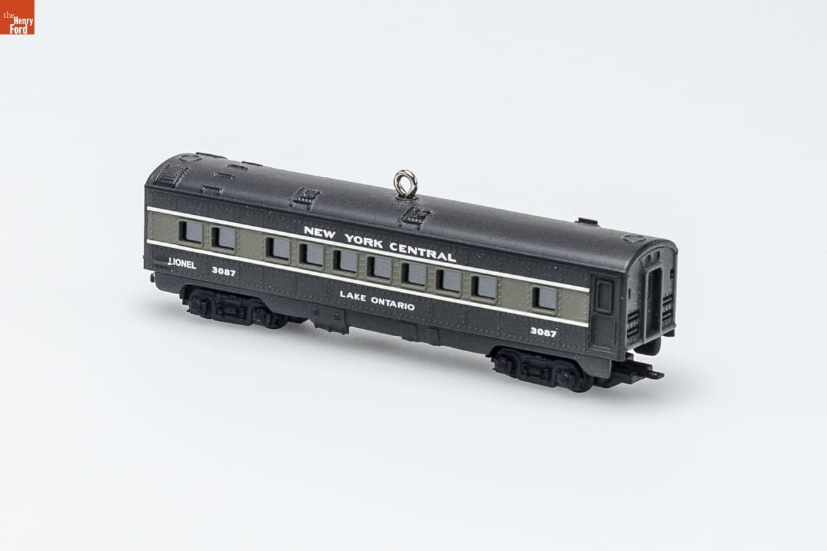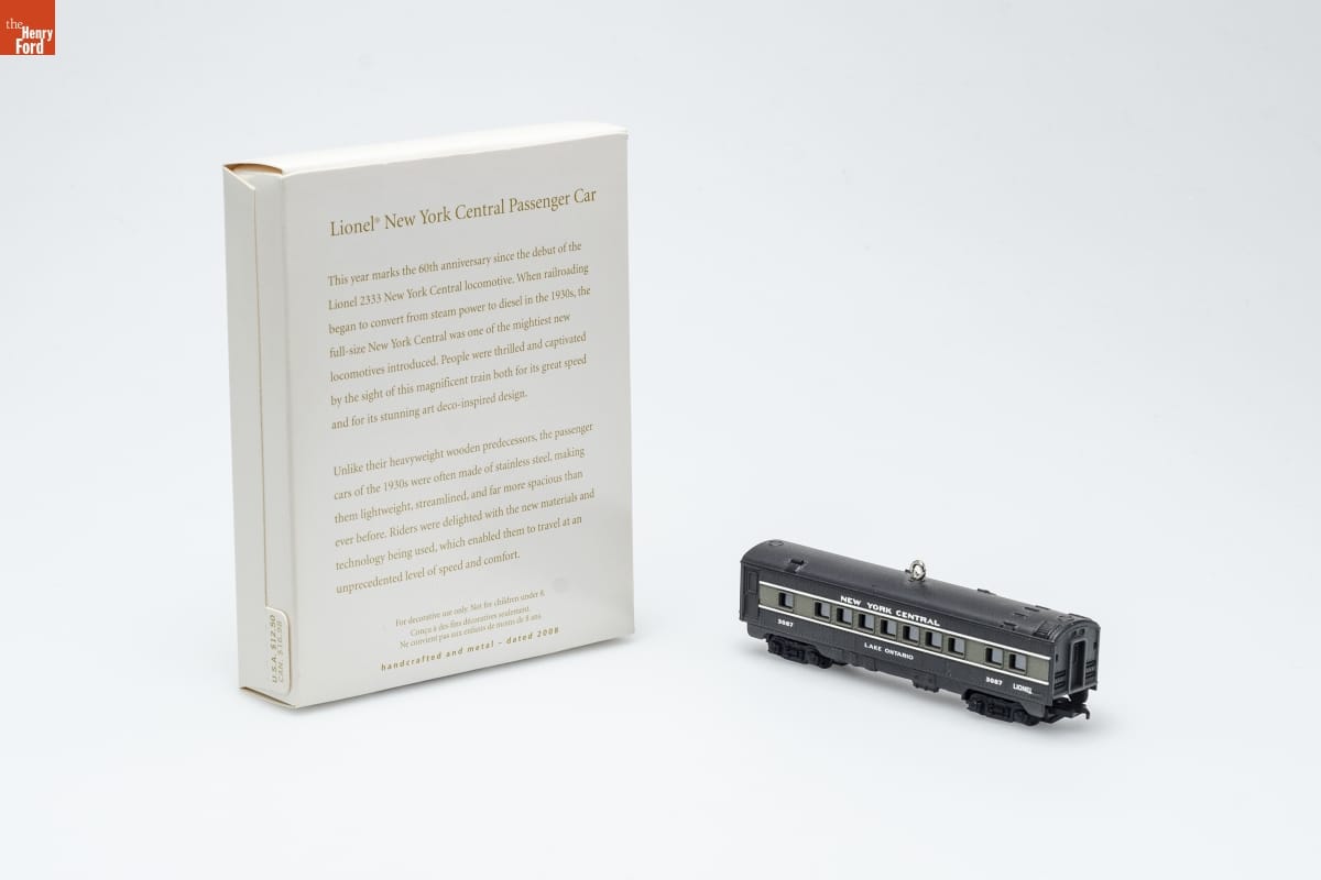 Lionel(R) New York Central Passenger Car / This year marks the 60th anniversary since the debut of the / Lionel 2333 New York Central locomotive. When railroading / began to convert from steam power to diesel in the 1930s, the / full-size New York Central was one of the mightiest new / locomotives introduced. People were thrilled and captivated / by the sight of this magnificent train both for its great speed / and for its stunning art deco-inspired design. / Unlike their heavyweight wooden predecessors, the passenger / cars of the 1930s were often made of stainless steel, making / them lightweight, streamlined, and far more spacious than / ever before. Riders were delighted with the new materials and / technology being used, which enabled them to travel at an / unprecedented level of speed and comfort. / For decorative use only. Not for children under 8. / Concue a des fins decoratives seulement. / Ne convient pas aux enfants de moins de 8 ans. / handcrafted and metal - dated 2008