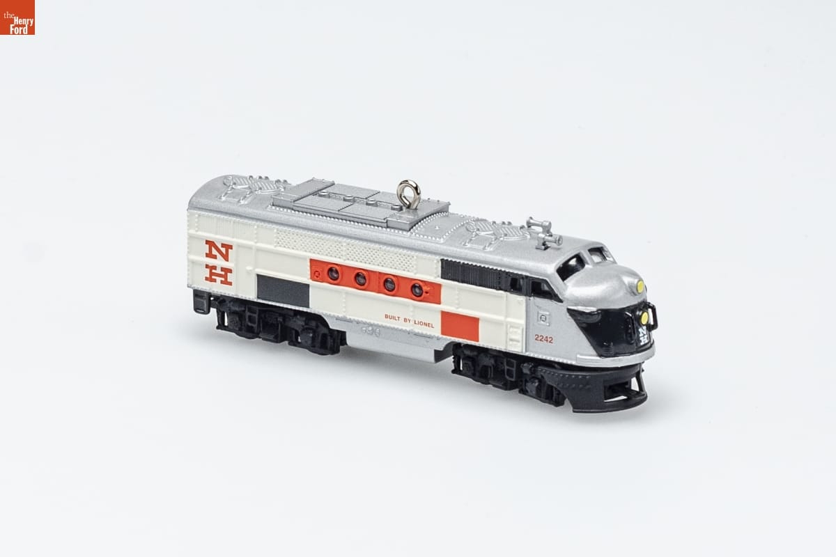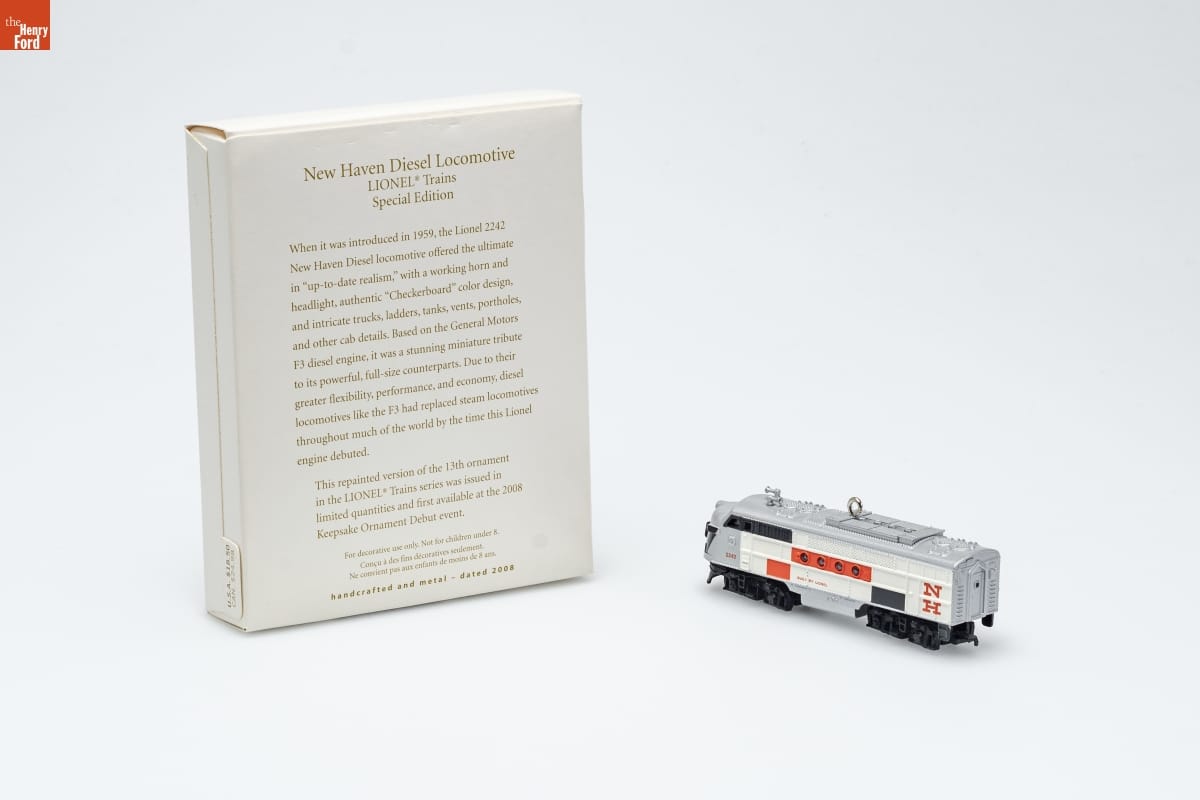 New Haven Diesel Locomotive / LIONEL(R) Trains / Special Edition / When it was introduced in 1959, the Lionel 2242 / New Haven Diesel locomotive offered the ultimate / in "up-to-date realism," with a working horn and / headlight, authentic "Checkerboard" color design, / and intricate trucks, ladders, tanks, vents, portholes, / and other cab details. Based on the General Motors / F3 diesel engine, it was a stunning miniature tribute / to its powerful, full-size counterparts. Due to their / greater flexibility, performance, and economy, diesel / locomotives like the F3 had replaced steam locomotives / throughout much of the world by the time this Lionel / engine debuted. / This repainted version of the 13th ornament / in the LIONEL(R) Trains series was issued in / limited quantities and first available at the 2008 / Keepsake Ornament Debut event. / For decorative use only. Not for children under 8. / Concue a des fins decoratives seulement. / Ne convient pas aux enfants de moins de 8 ans. / handcrafted and metal - dated 2008