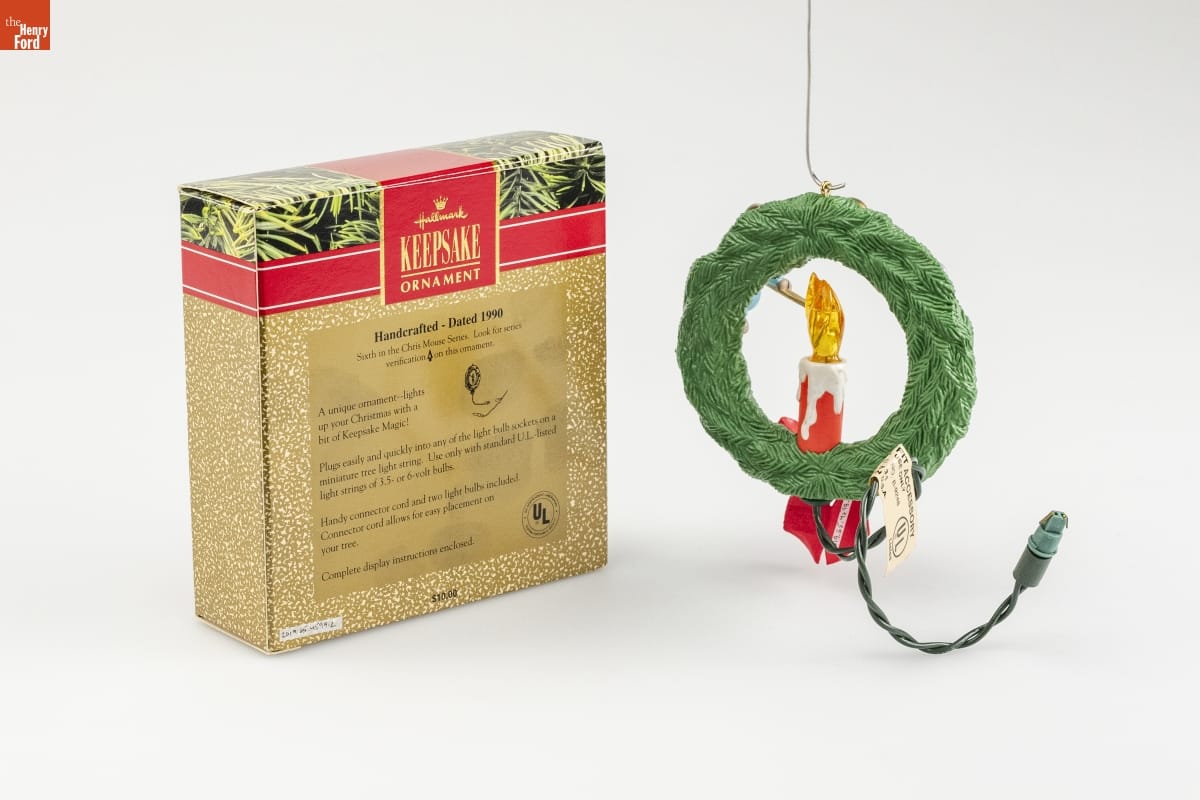 [TM] / Hallmark / KEEPSAKE / ORNAMENT / Handcrafted - Dated 1990 / Sixth in the Chris Mouse Series. Look for series / verification 6 on this ornament. / A unique ornament -- / lights / up your Christmas with a / bit of Keepsake Magic! / Plugs easily into any of the light bulb sockets on a / miniature tree light string. Use only with standard U.L.- listed / light strings of 3.5- or 6- volt bulbs. / Handy connector cord and two light bulbs included. / Connector cord allows for easy placement on your tree. / Complete display instructions enclosed.
