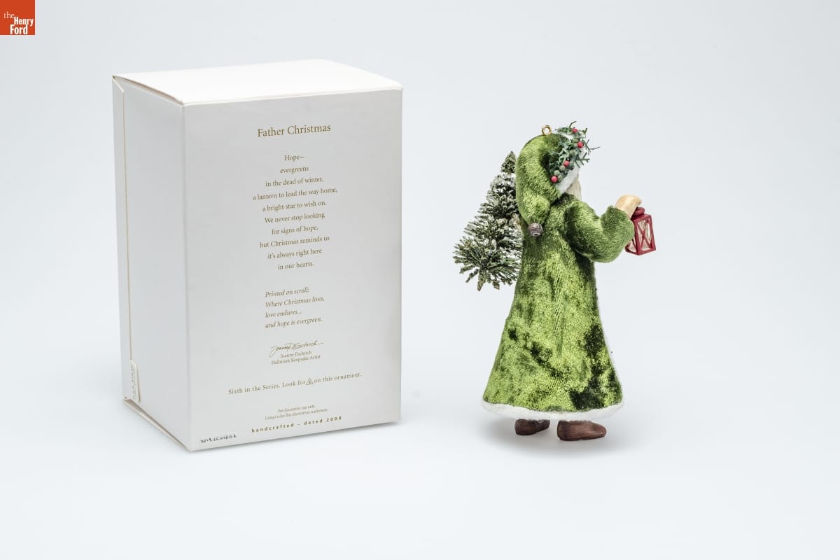 Father Christmas / Hope-- / evergreens / in the dead of winter, / a lantern to lead the way home, / a bright star to wish on. / We never stop looking / for signs of hope, / but Christmas reminds us / it's always right here / in our hearts. / Printed on scroll: / Where Christmas lives, / love endures... / and hope is evergreen. / Joanne Eschrich / Hallmark Keepsake Artist / Sixth in the Series. Look for 6 on this ornament. / For decorative use only. / Concu a des fins decoratives seulement. / handcrafted - dated 2009