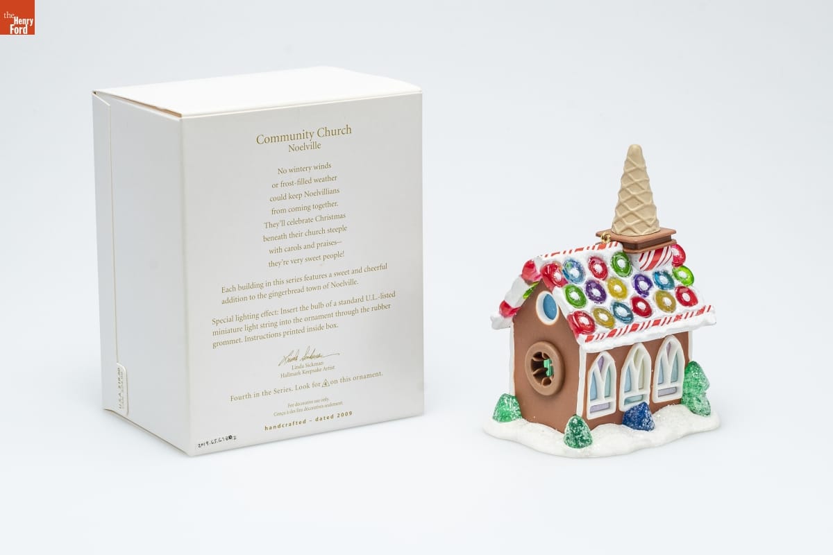 Community Church / Noelville / No wintery winds / or frost-filled weather / could keep Noelvillians / from coming together. / They'll celebrate Christmas / beneath their church steeple / with carols and praises-- / they're very sweet people! / Each building in this series features a sweet and cheerful / addition to the gingerbread town of Noelville. / Special lighting effect: Insert the bulb of a standard U.L.-listed / miniature light string into the ornament through the rubber / grommet. Instructions printed inside box. / Linda Sickman / Hallmark Keepsake Artist / Fourth in the Series. Look for 4 on this ornament. / For decorative use only. / Concu a des fins decoratives seulement. / handcrafted - dated 2009