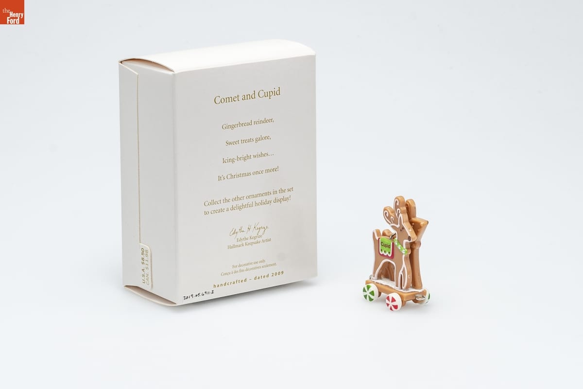 Comet and Cupid / Gingerbread reindeer, / Sweet treats galore, / Icing-bright wishes... / It's Christmas once more! / Collect the other ornaments in the set / to create a delightful holiday display! / Edythe Kegrize / Hallmark Keepsake Artist / For decorative use only. / Concu a des fins decoratives seulement. / handcrafted - dated 2009