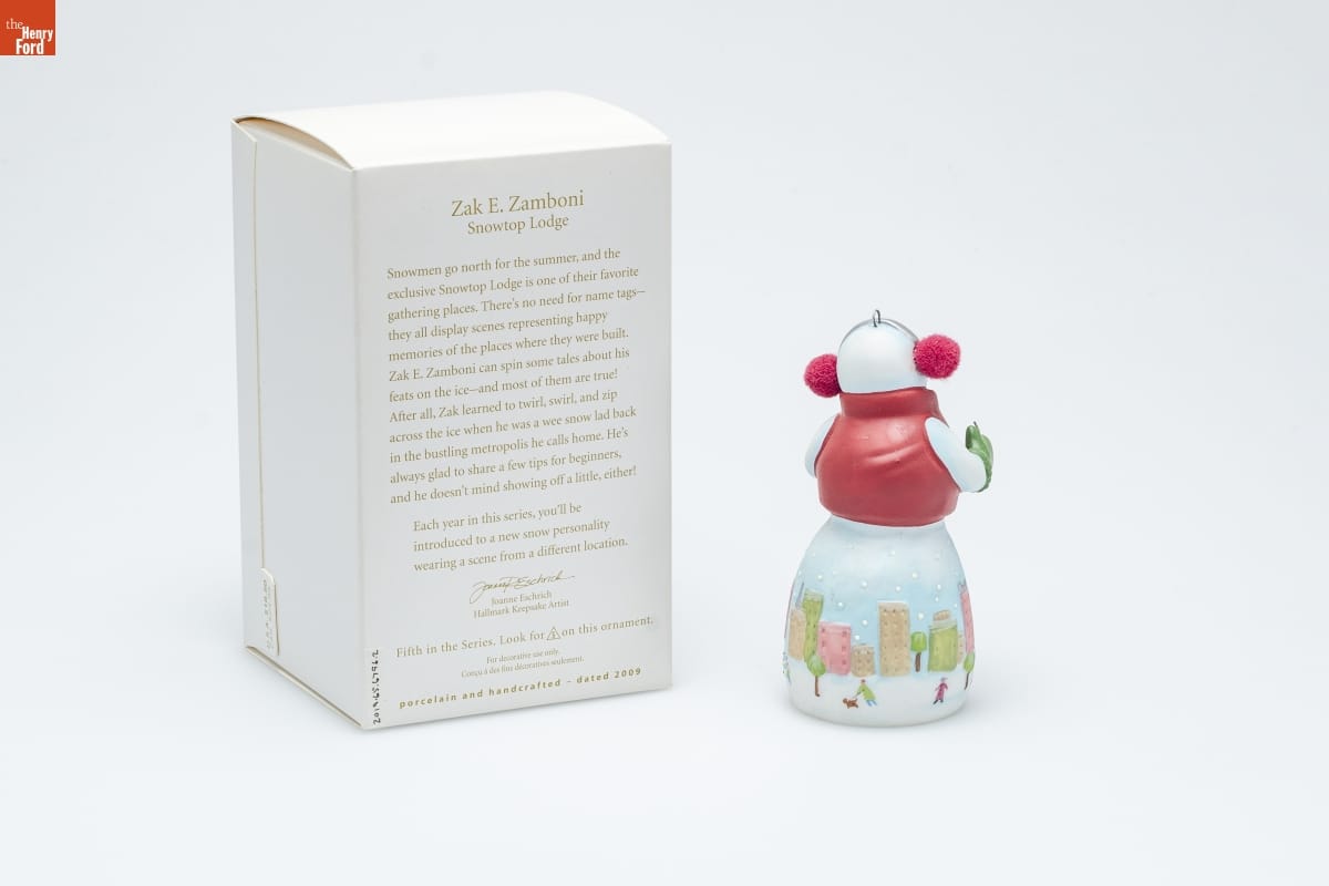 Zak E. Zamboni / Snowtop Lodge / Snowmen go north for the summer, and the / exclusive Snowtop Lodge is one of their favorite / gathering places. There's no need for name tags-- / they all display scenes representing happy / memories of the places where they were built. / Zak E. Zamboni can spin some tales about his / feats on the ice--and most of them are true! / After all, Zak learned to twirl, swirl, and zip / across the ice when he was a wee snow lad back / in the bustling metropolis he calls home. He's / always glad to share a few tips for beginners, / and he doesn't mind showing off a little, either! / Each year in this series, you'll be / introduced to a new snow personality / wearing a scene from a different location. / Joanne Eschrich / Hallmark Keepsake Artist / Fifth in the Series. Look for 5 on this ornament. / For decorative use only. / Concu a des fins decoratives seulement. / porcelain and handcrafted - dated 2009