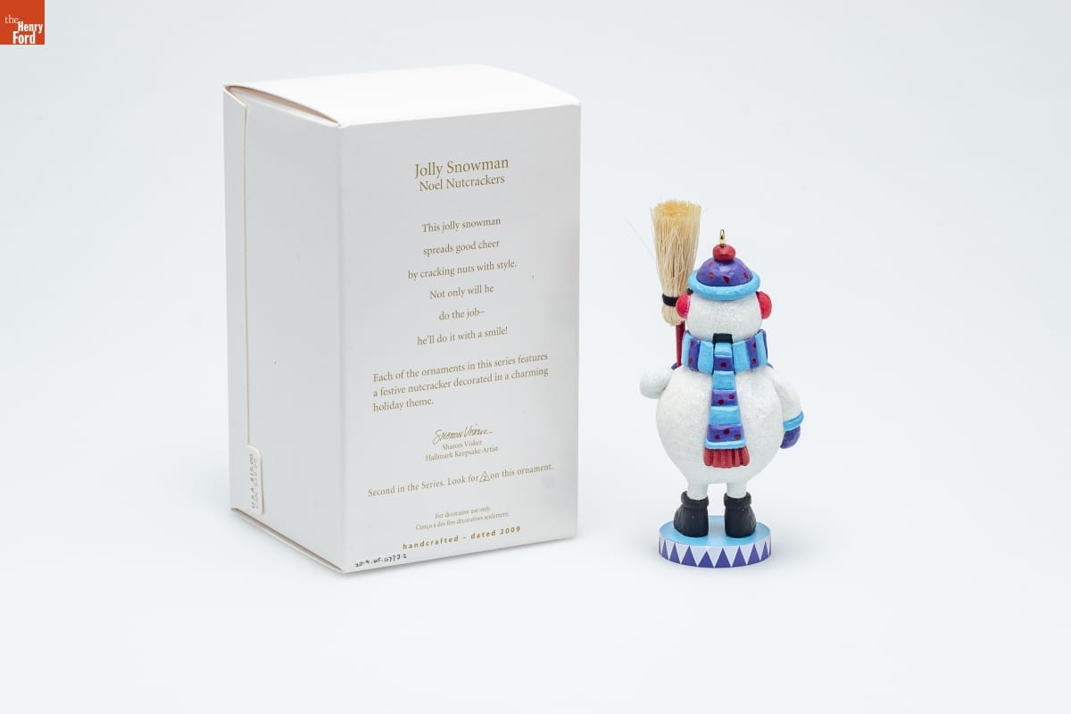 Jolly Snowman / Noel Nutcrackers / This jolly snowman / spreads good cheer / by cracking nuts with style. / Not only will he / do the job-- / he'll do it with a smile! / Each of the ornaments in this series features / a festive nutcracker decorated in a charming holiday theme. / Sharon Visker / Hallmark Keepsake Artist / Second in the Series. Look for 2 on this ornament. / For decorative use only. / Concu a des fins decoratives seulement. / handcrafted - dated 2009