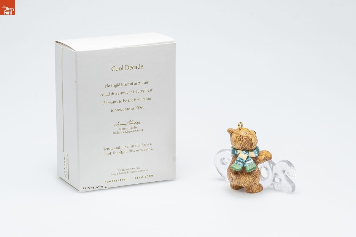 Cool Decade / No frigid blast of arctic air / could drive away this furry bear. / He wants to be the first in line / to welcome in 2009! / Tammy Haddix / Hallmark Keepsake Artist / Tenth and Final in the Series. / Look for 10 on this ornament. / For decorative use only. / Concu a des fins decoratives seulement. / handcrafted - dated 2009