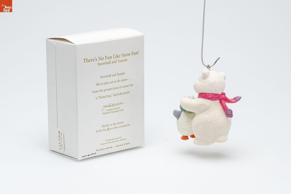 There's No Fun Like Snow Fun! / Snowball and Tuxedo / Snowball and Tuxedo / like to play out in the snow-- / 'cause the greatest kind of winter fun / is "friend fun," don'tcha know! / Joanne Eschrich / Hallmark Keepsake Artist / Ninth in the Series. / Look for 9 on this ornament. / For decorative use only. / Concu a des fins decoratives seulement. / handcrafted - dated 2009