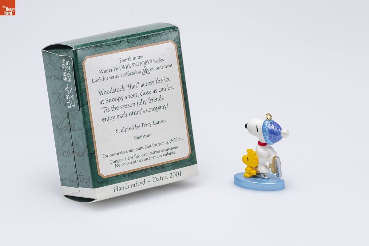 Fourth in the / Winter Fun With SNOOPY(R) Series. / Look for series verification 4 on ornament. / Woodstock "flies" across the ice / at Snoopy's feet, close as can be. / 'Tis the season jolly friends / enjoy each other's company! / Sculpted by Tracy Larsen / Miniature / For decorative use only. Not for young children. / Concue a des fins decoratives seulement. / Ne convient pas aux jeunes enfants. / Handcrafted - Dated 2001