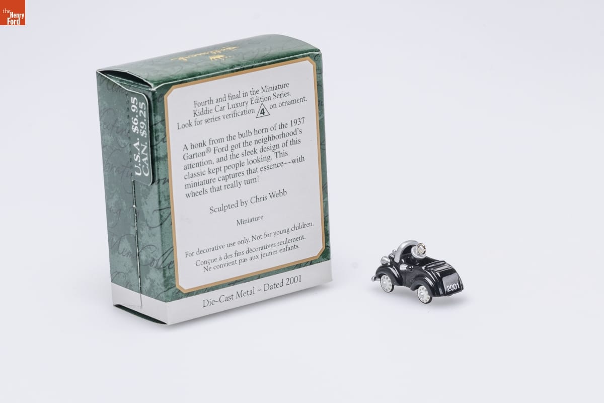 Fourth and final in the Miniature / Kiddie Car Luxury Edition Series. / Look for series verification 4 on ornament. / A honk from the bulb horn of the 1937 / Garton(R) Ford got the neighborhood's / attention, and the sleek design of this / classic kept people looking. This / miniature captures that essence--with / wheels that really turn! / Sculpted by Chris Webb / Miniature / For decorative use only. Not for young children. / Concue a des fins decoratives seulement. / Ne convient pas aux jeunes enfants. / Die-Cast - Dated 2001