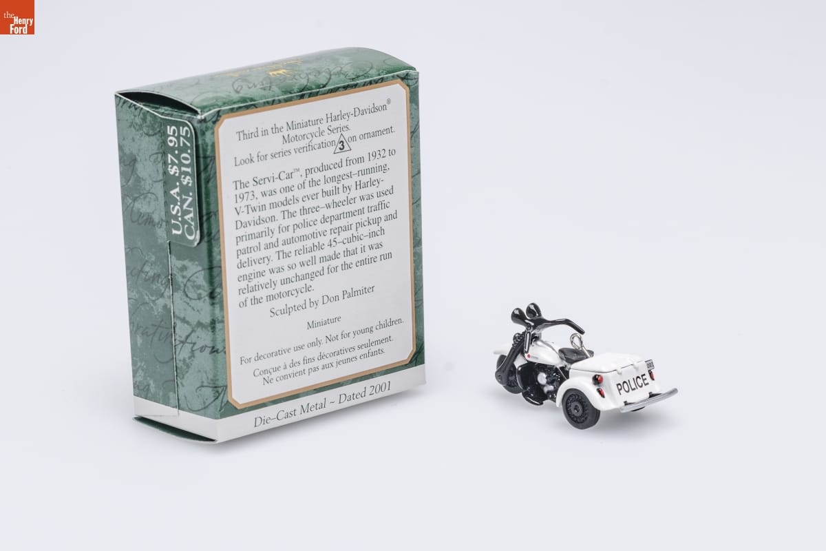 Third in the Miniature Harley-Davidson(R) / Motorcycle Series. / Look for series verification 3 on this ornament. / The Servi-Car TM, produced from 1932 to / 1973, was one of the longest-running, / V-Twin models ever built by Harley- / Davidson. The three-wheeler was used / primarily for police department traffic / patrol and automotive repair pickup and / delivery. The reliable 45-cubic-inch / engine was so well made that it was / relatively unchanged for the entire run / of the motorcycle. / Sculpted by Don Palmiter / Miniature / For decorative use only. Not for young children. / Concue a des fins decoratives seulement. / Ne convient pas aux jeaunes enfants. / Die-Cast Metal - Dated 2001