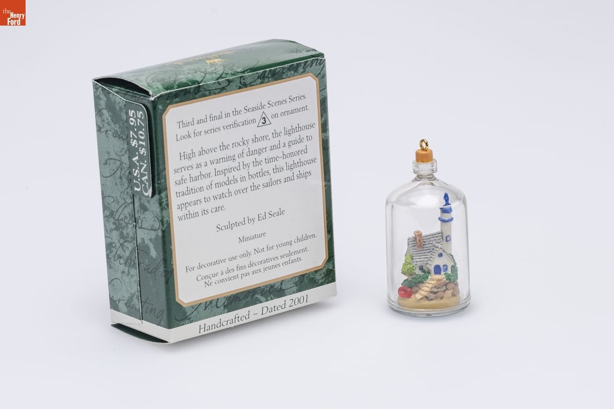 Third and final in the Seaside Scenes Series. / Look for series verification 3 on ornament. / High above the rocky shore, the lighthouse / serves as a warning of danger and a guide to / safe harbor. Inspired by the time-honored / tradition of models in bottles, this lighthouse / appears to watch over the sailors and ships / within its care. / Sculpted by Ed Seale / Miniature / For decorative use only. Not for young children. / Concue a des fins decoratives seulement. / Ne convient pas aux jeunes enfants. / Handcrafted - Dated 2001